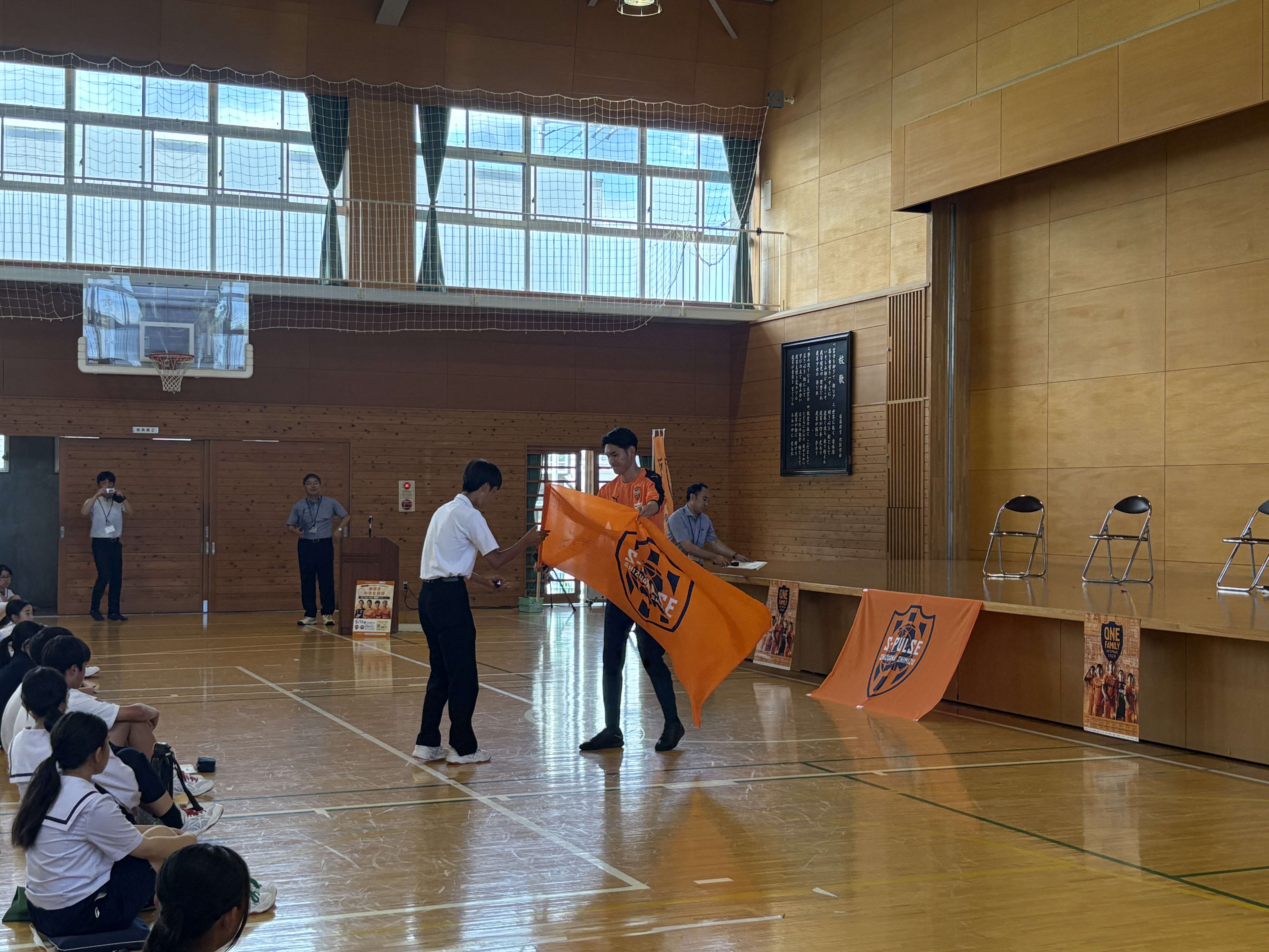 質問コーナーが終わると、代表生徒からお礼の言葉をいただき、選手はサインしたビッグフラッグを学校にプレゼントしました。最後に、阿部選手と生徒達とで記念撮影を行いました。