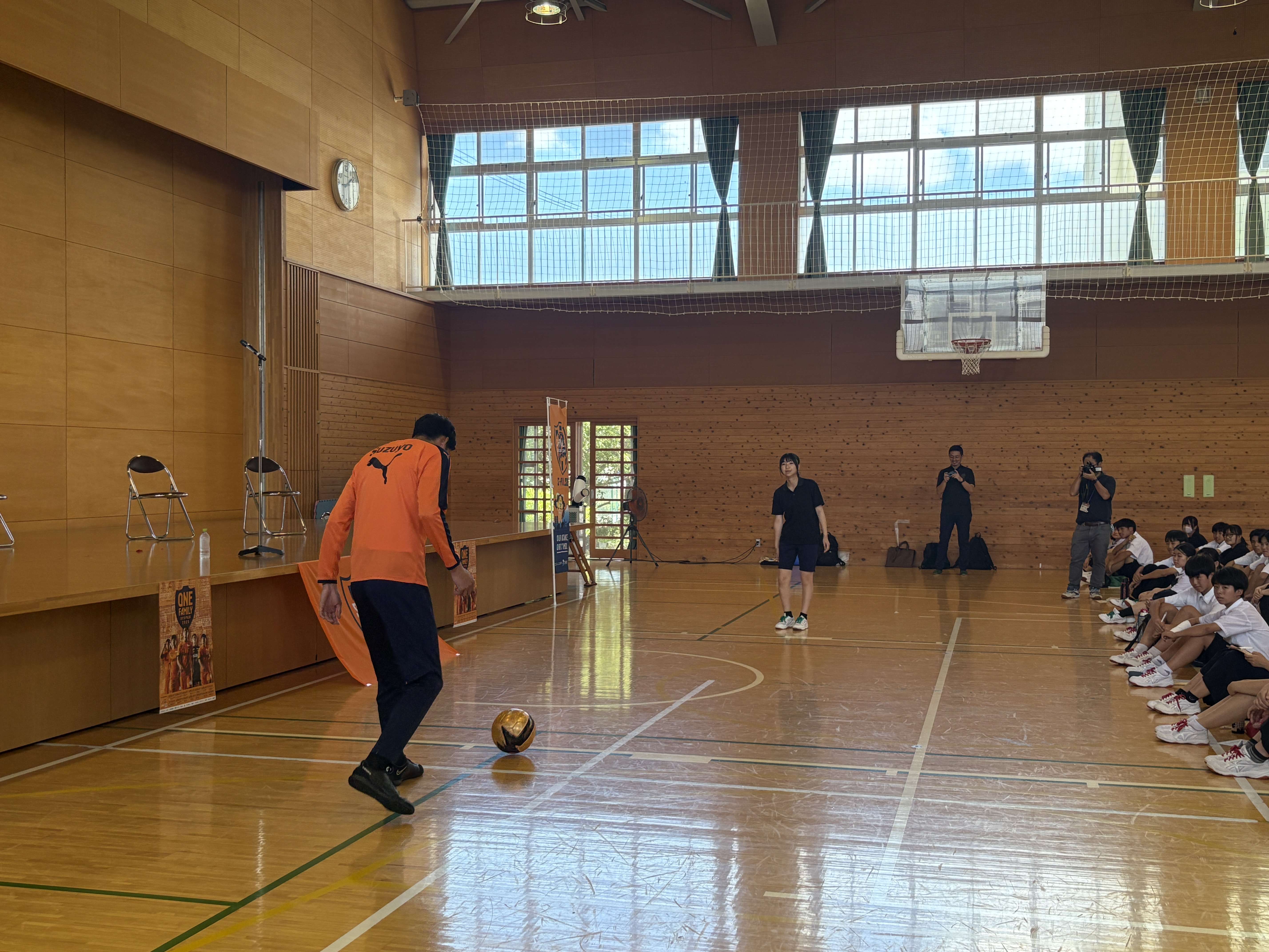 まず阿部選手が自己紹介し、その後に選手と生徒がパス交換を行いました。出てきてくれた代表生徒さんはサッカー未経験でしたが、阿部選手が優しくサポートしてくれて楽しんでいる様子でした。阿部選手との交流を通して少しずつ緊張もほぐれて、最後には笑顔も見られました。