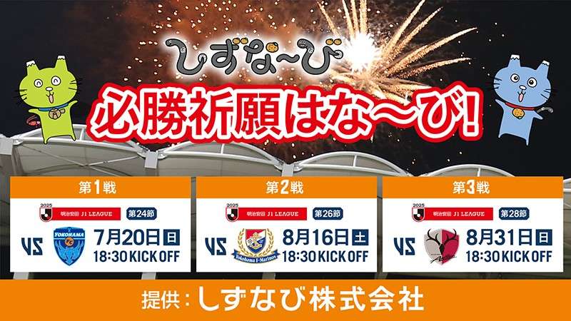 エスパルスは、しずなび株式会社にご協賛をいただき、夏のホームゲーム3試合を対象として、ハーフタイムに『しずな~び 必勝祈願はな~び』(花火)を実施しますので、下記の通りお知らせいたします。本企画は、ホームでのエスパルスの勝利を後押しいただくこと、またご来場の皆様に今以上にスタジアム観戦をお楽しみいただくことを目的としており、今シーズンの夏も9年連続での実施となります。