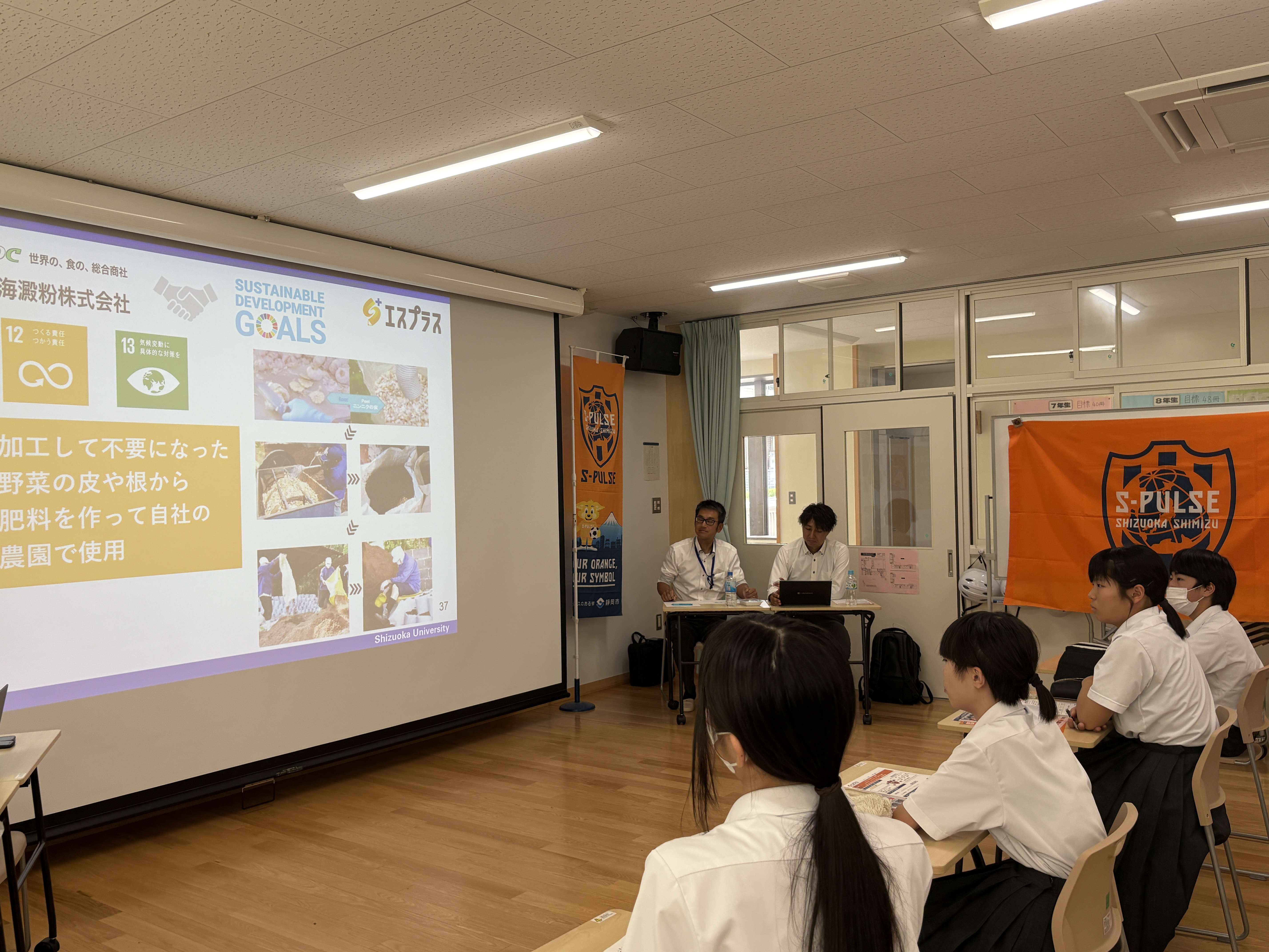 7月3日(木) 静岡市立清水両河内中学校にて、クラブパートナーの東海澱粉株式会社よりゲスト講師2名を迎え『エスプラス』「地域貢献や社会に出て必要なチカラを考えるキャリア教育授業 ~食品商社編~」を実施しました。