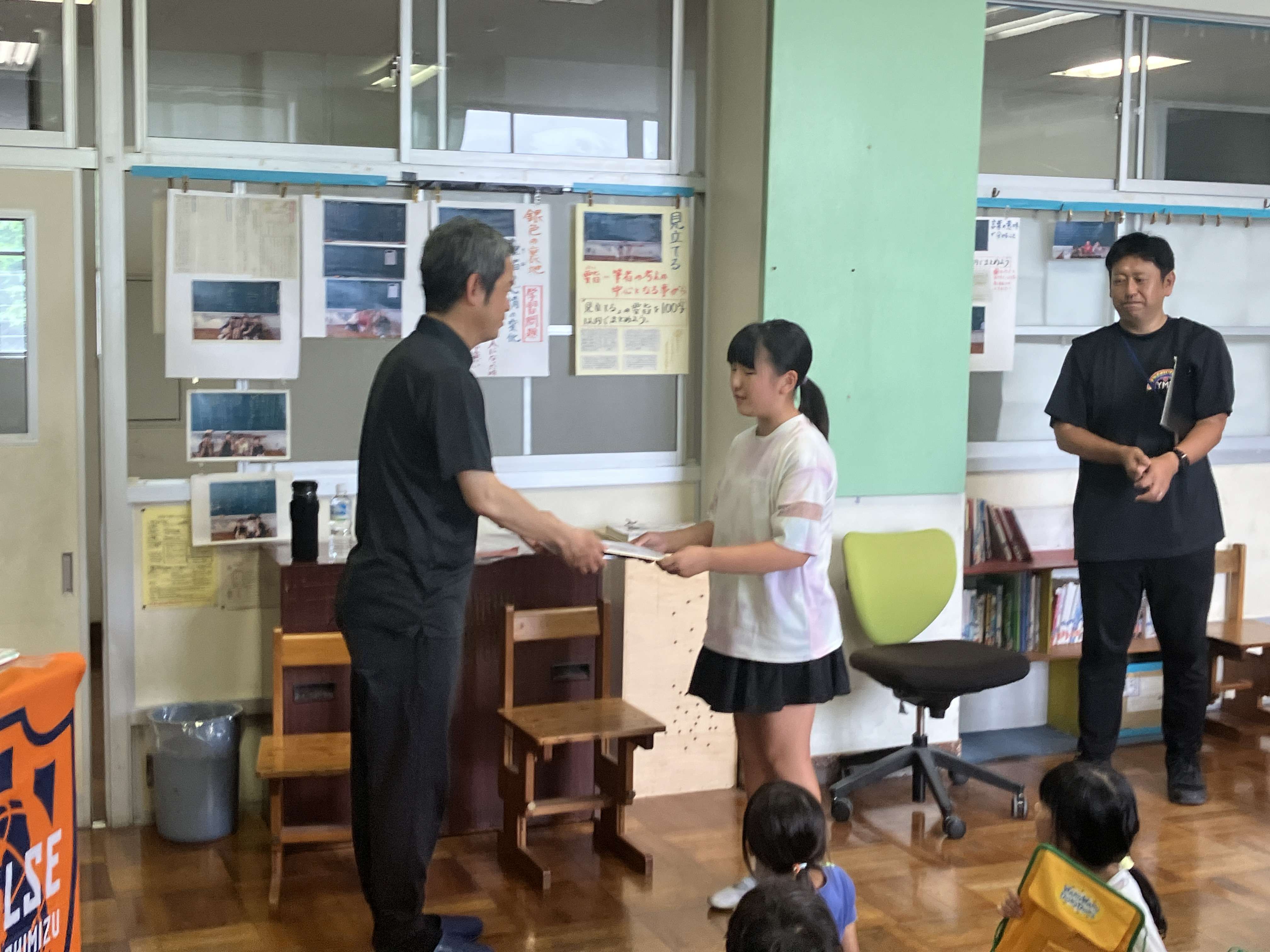 最後に横山コーチから代表児童にサインが贈呈され、全員で記念撮影をして授業は終了となりました。