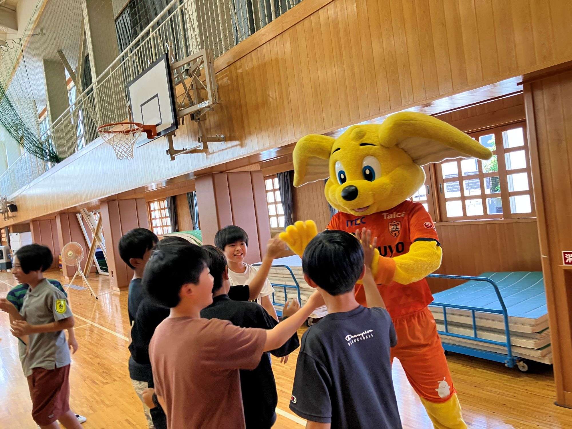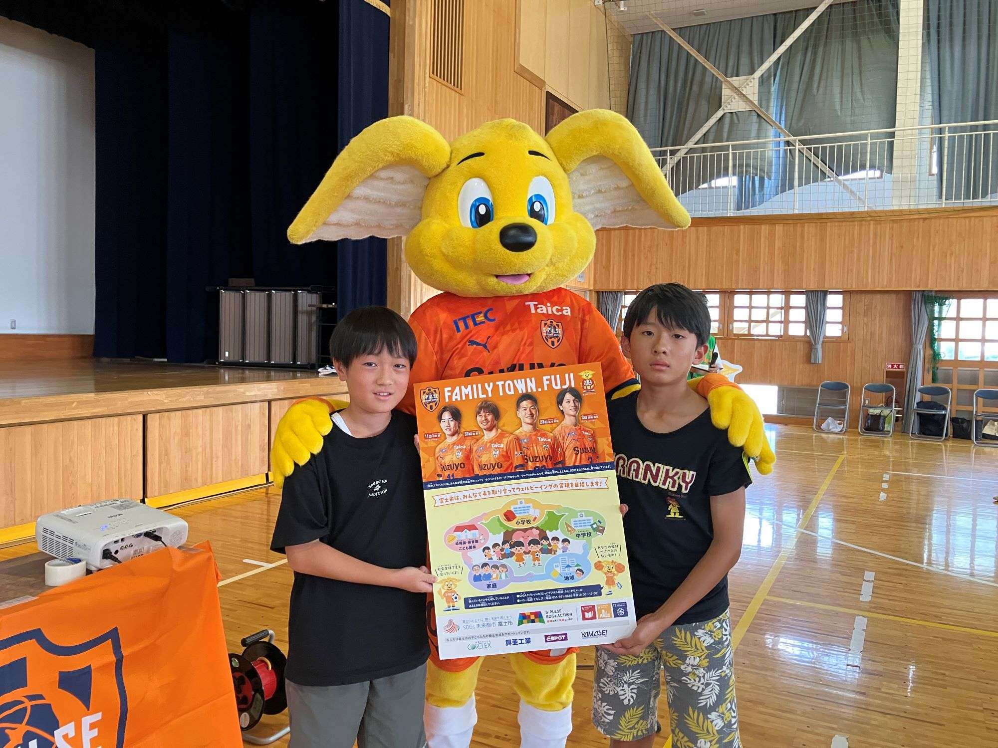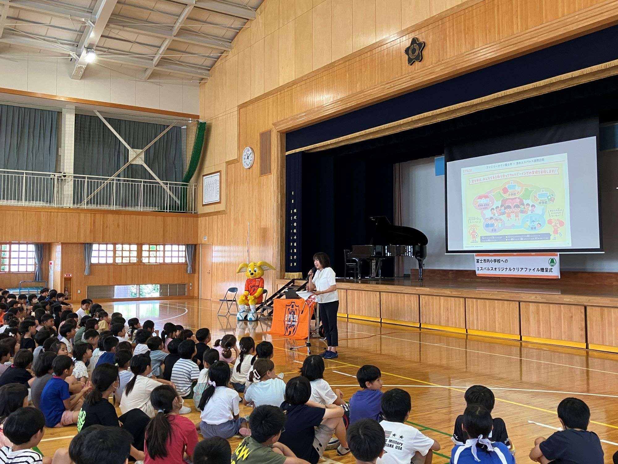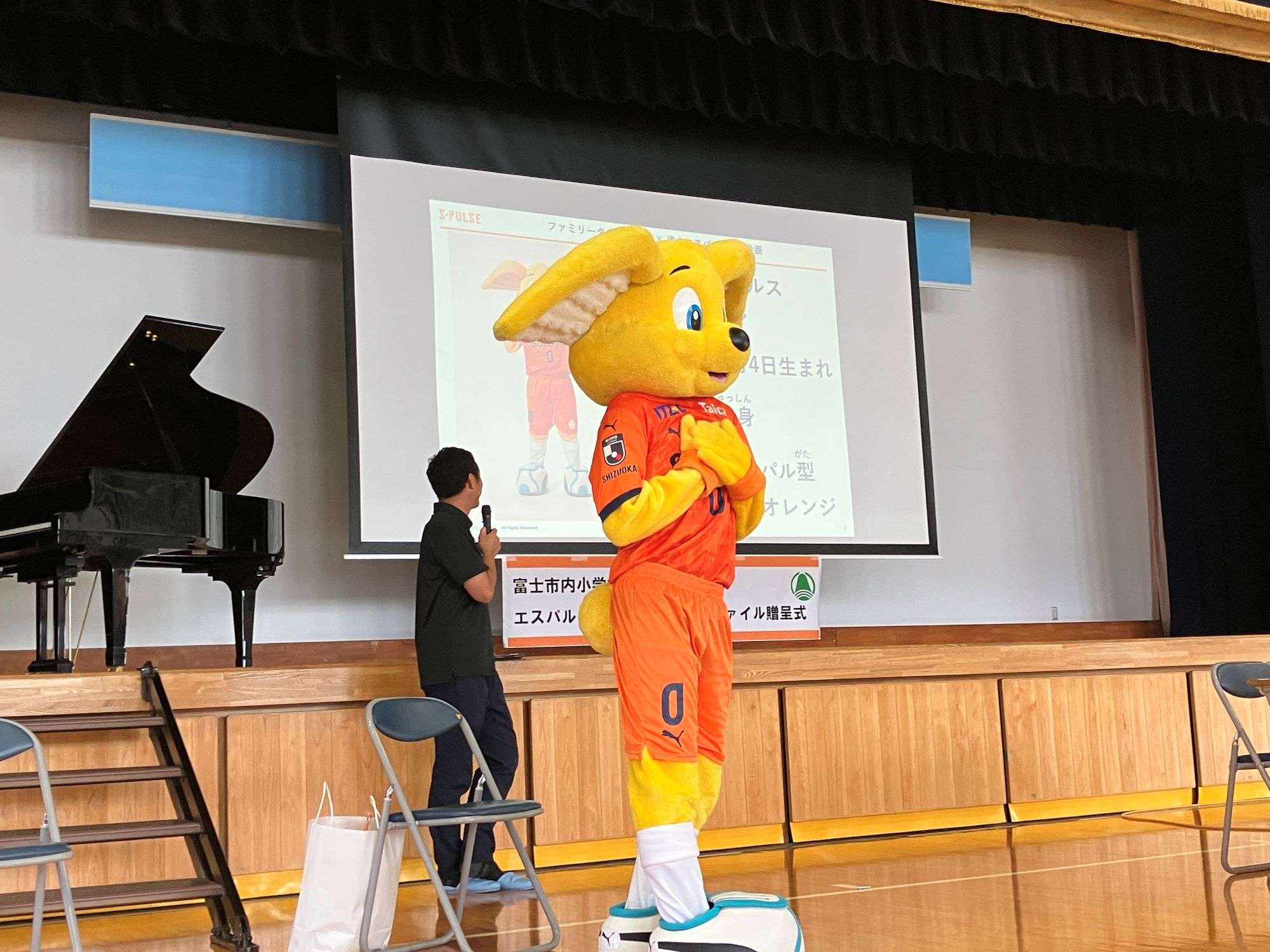 7月18日(金)富士市立富士川第一小学校にて、クリアファイル贈呈イベントを実施し、オフィシャルマスコットキャラクターのパルちゃんが参加しました。この日は夏休み前最後の登校日。全校集会の中でパルちゃんが登場すると、児童の皆さんから「パルちゃんだ!」「かわいい!こっちに来て!」と大きな歓声で迎えられました。富士市教育委員会様よりファイルの説明をいただいた後、代表児童へファイルを贈呈しました。