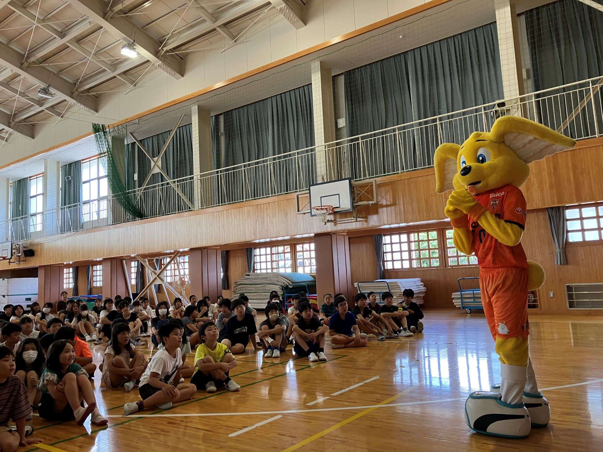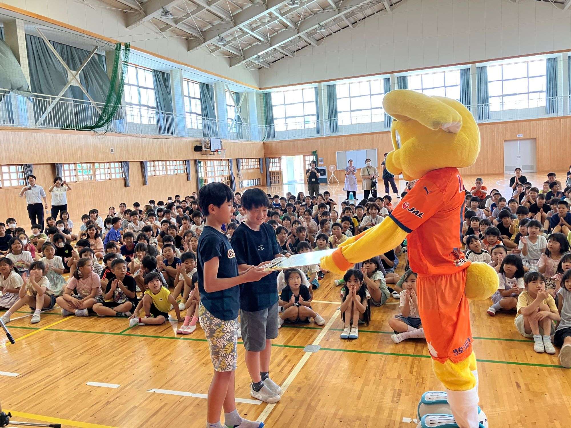 また、「夏休みにどんなことを頑張ればよいですか?」といった質問には、エスパルスの北川航也選手と住吉ジェラニレショーン選手からのスペシャルメッセージ動画を放映しました。児童たちはパルちゃんと楽しく交流しながら、また選手メッセージに聞き入る様子でお話を聞いてくれました。