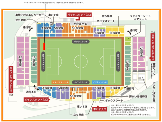 8月31日(日)に行われる明治安田J1リーグ第28節 鹿島アントラーズ戦(18:30キックオフ@IAIスタジアム日本平)において、西サイドゴール裏1列目LEDビジョン広告看板裏(※バックスタンド寄り)に『エキサイティングシート』を設置(最大16席)いたします。西サイドスタンド1F指定席をご購入の際は、下記設置エリアをご確認の上、ご了承の上でお座席をご選択ください。