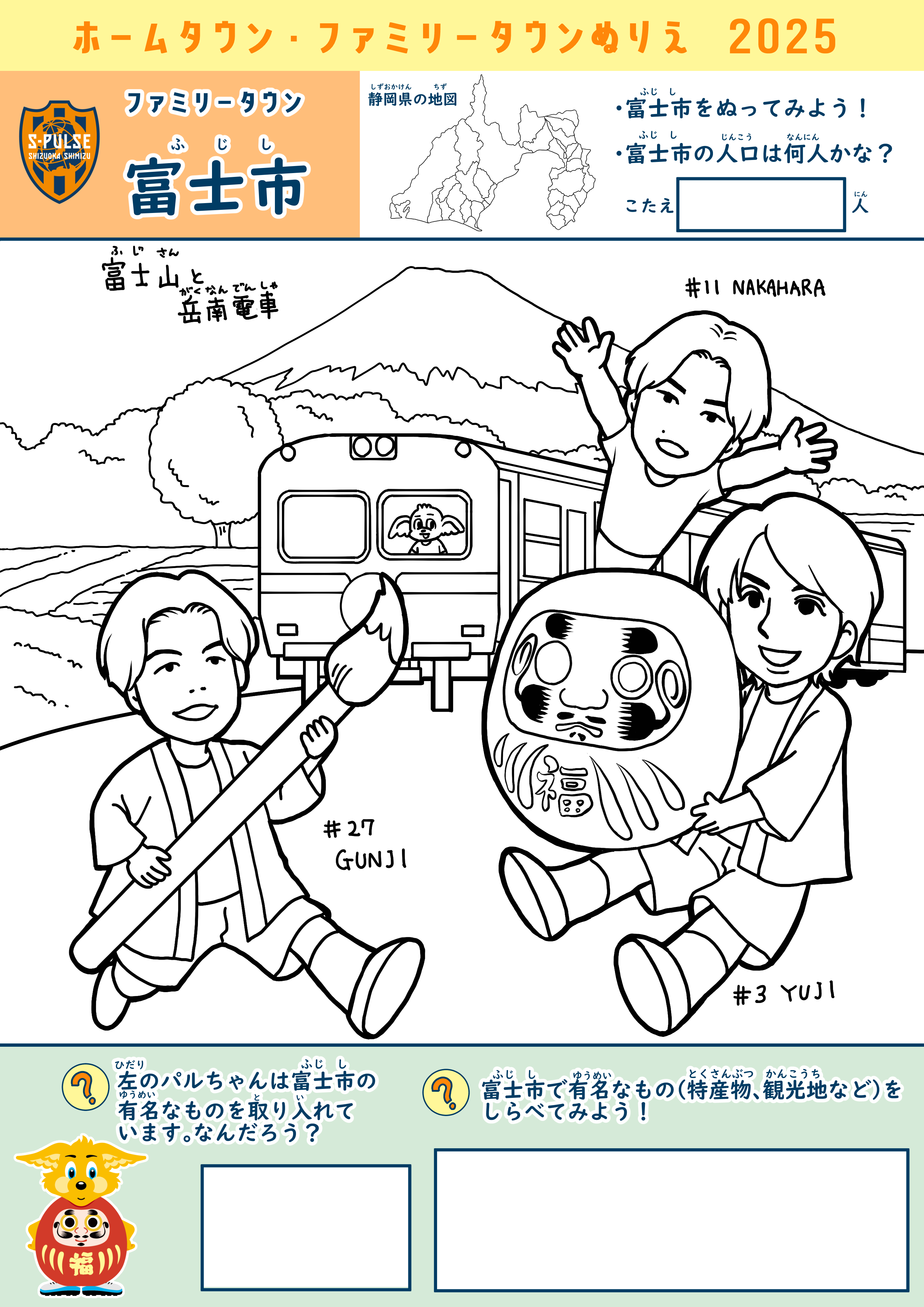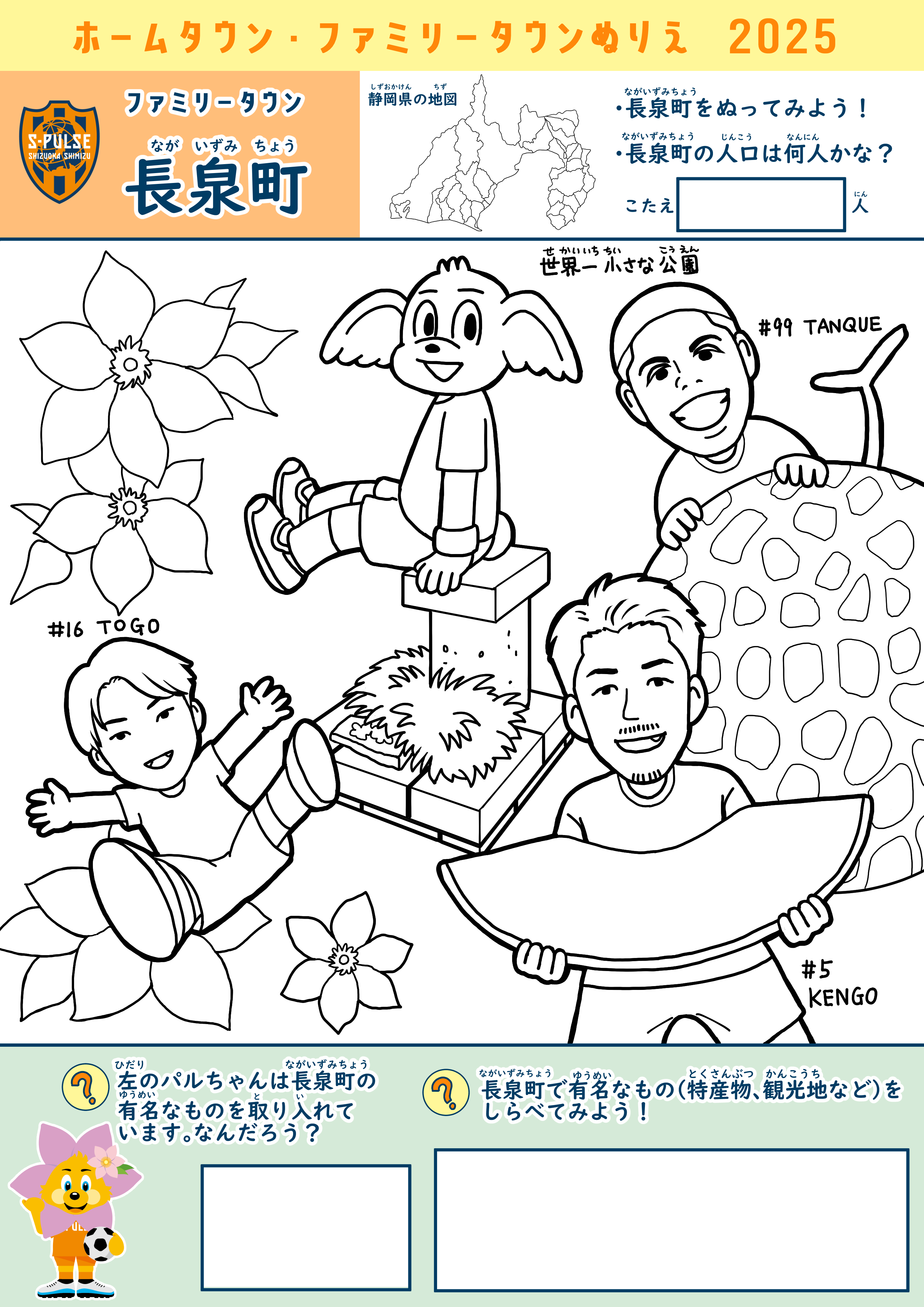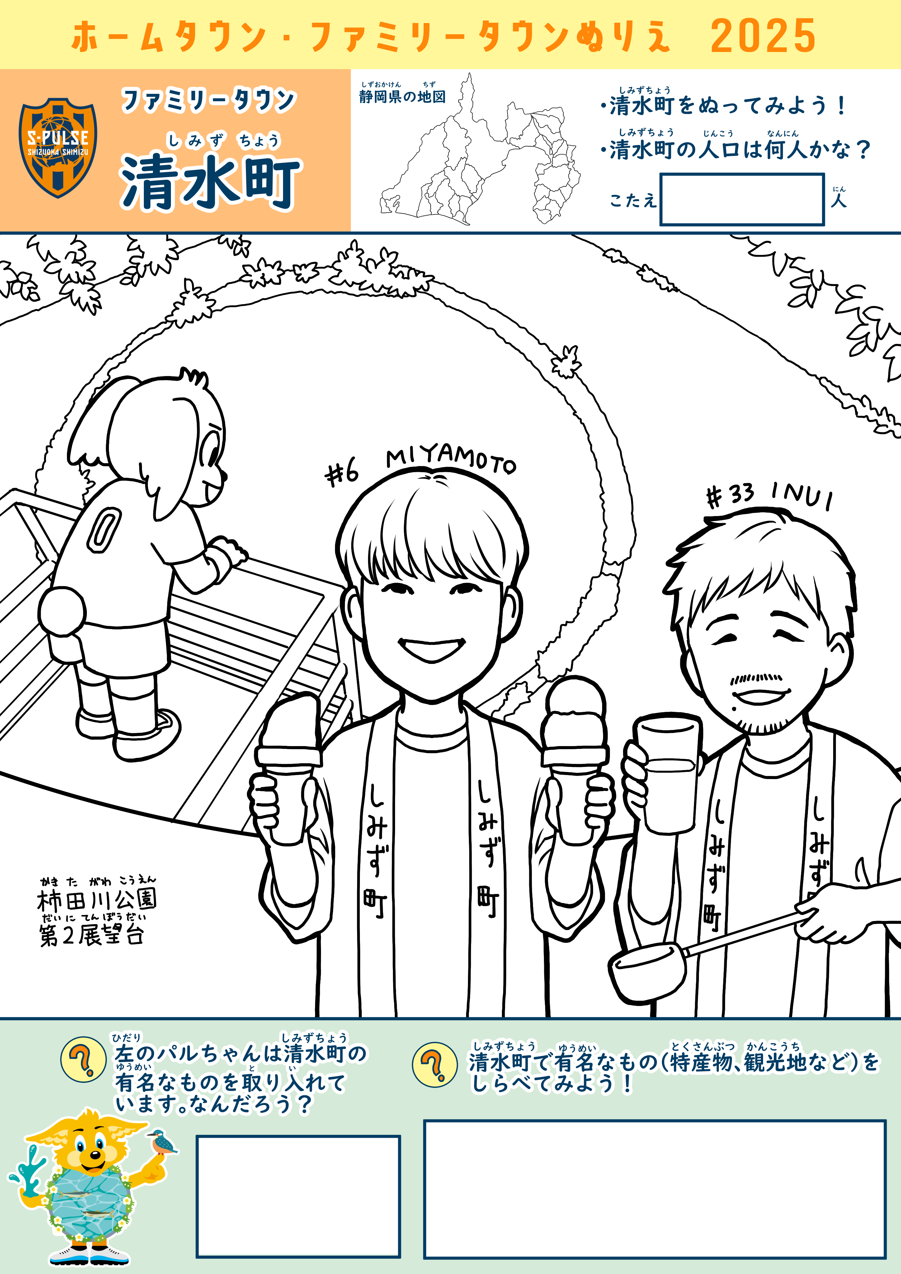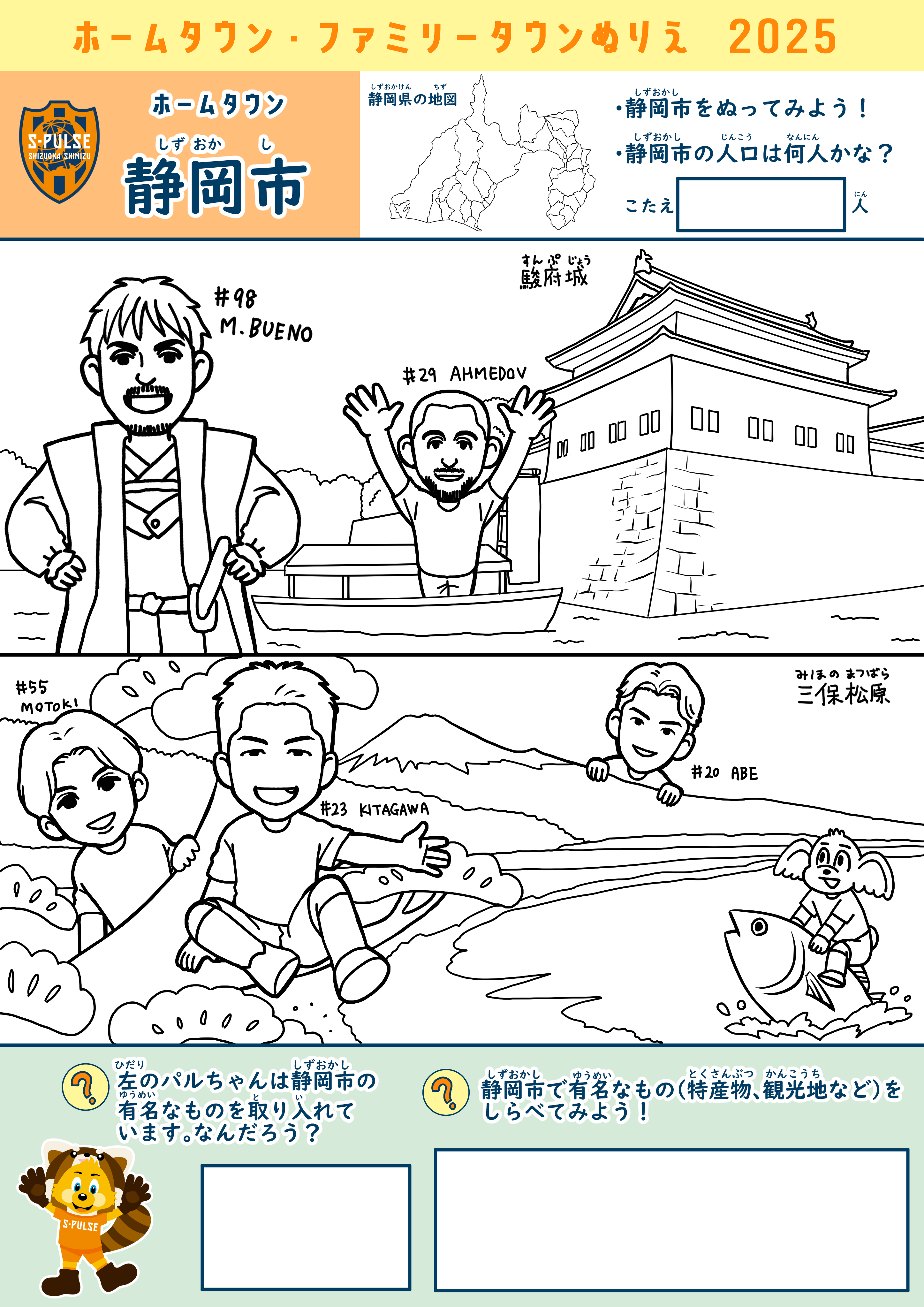 ぬり絵には各市町の人口や特産物・観光地などを記入する欄も設けています。ぜひホームタウン、ファミリータウンをもっと知り、たくさんの人にエスパルスのある街を身近に感じていただけたら嬉しく思います。