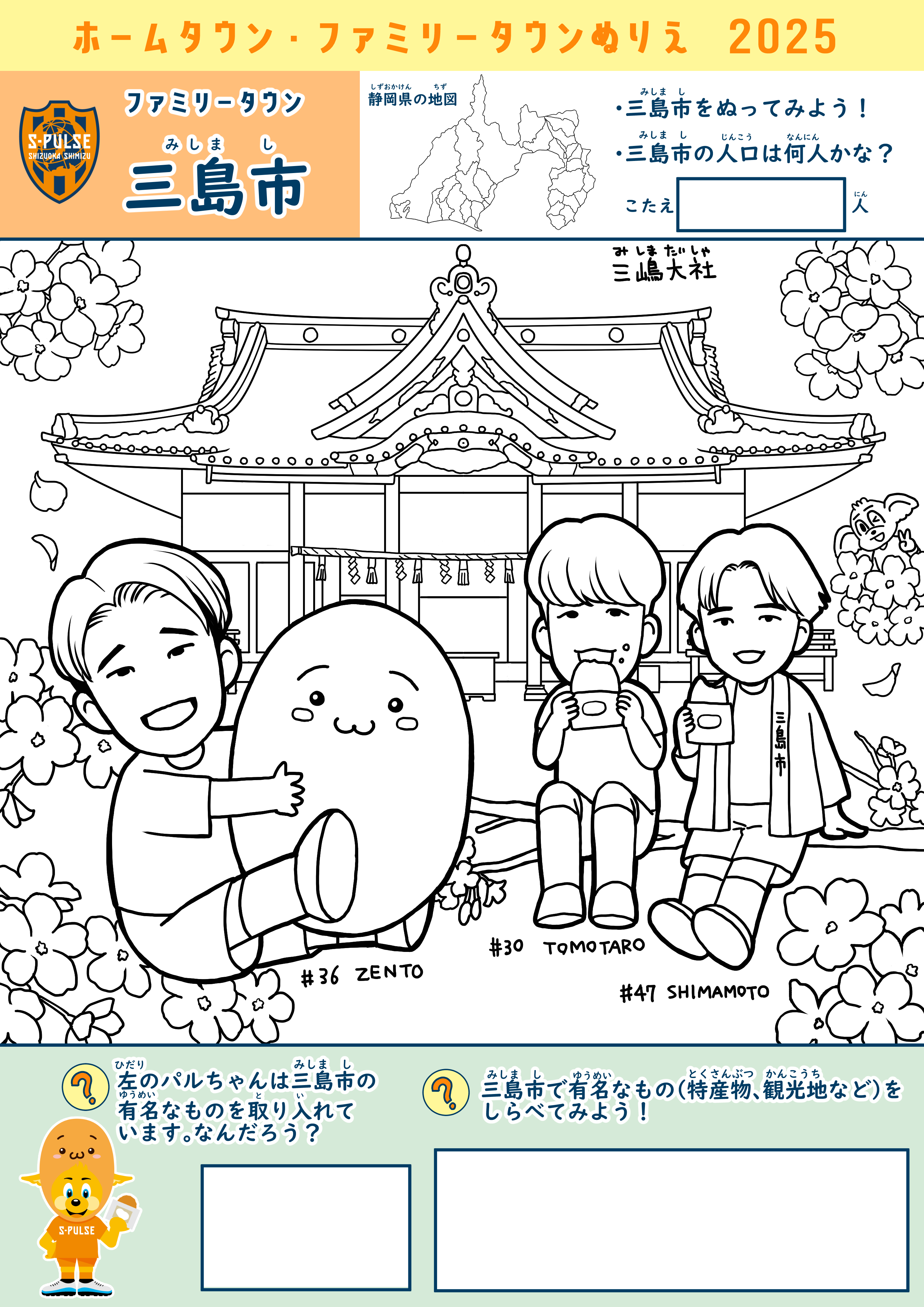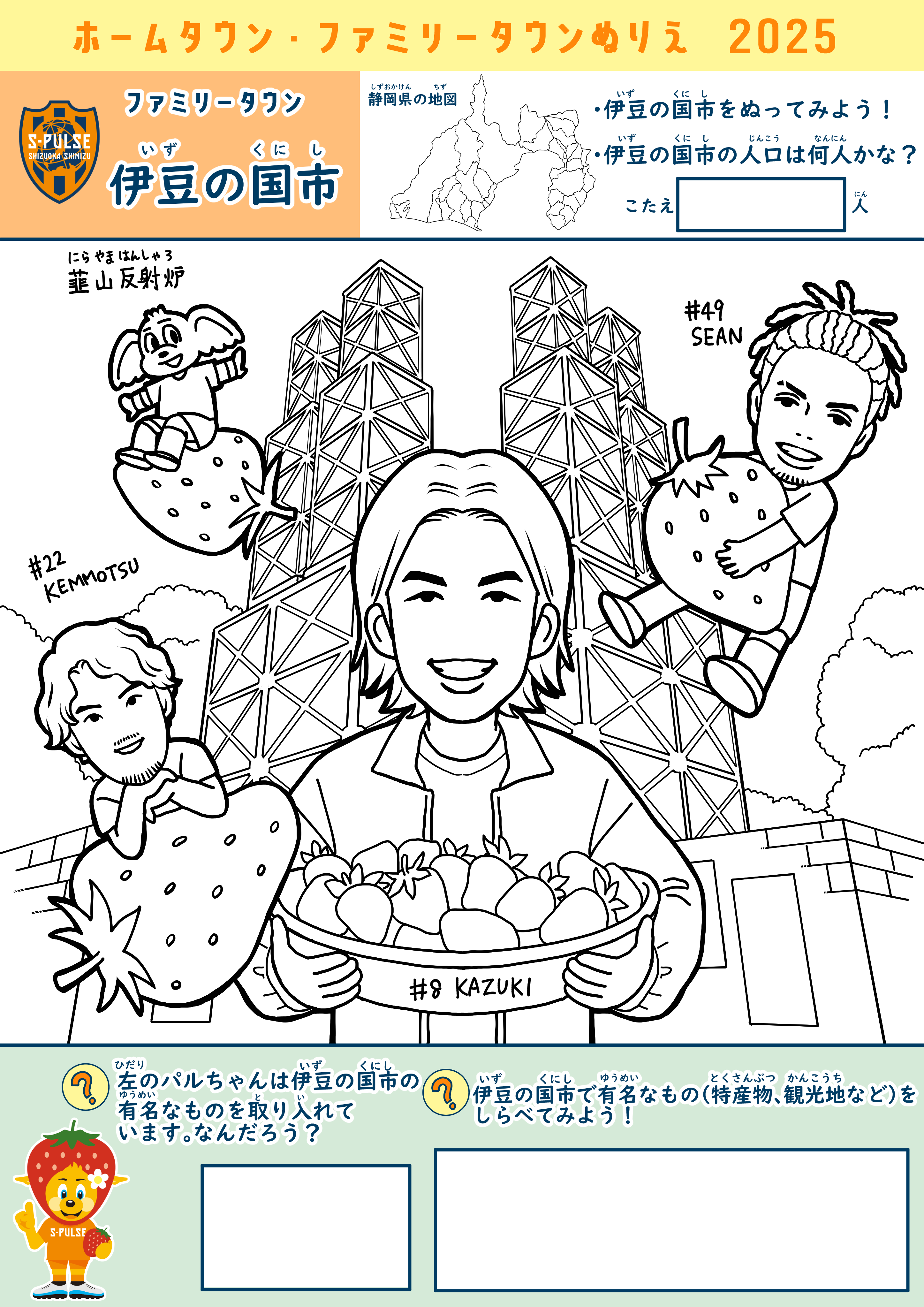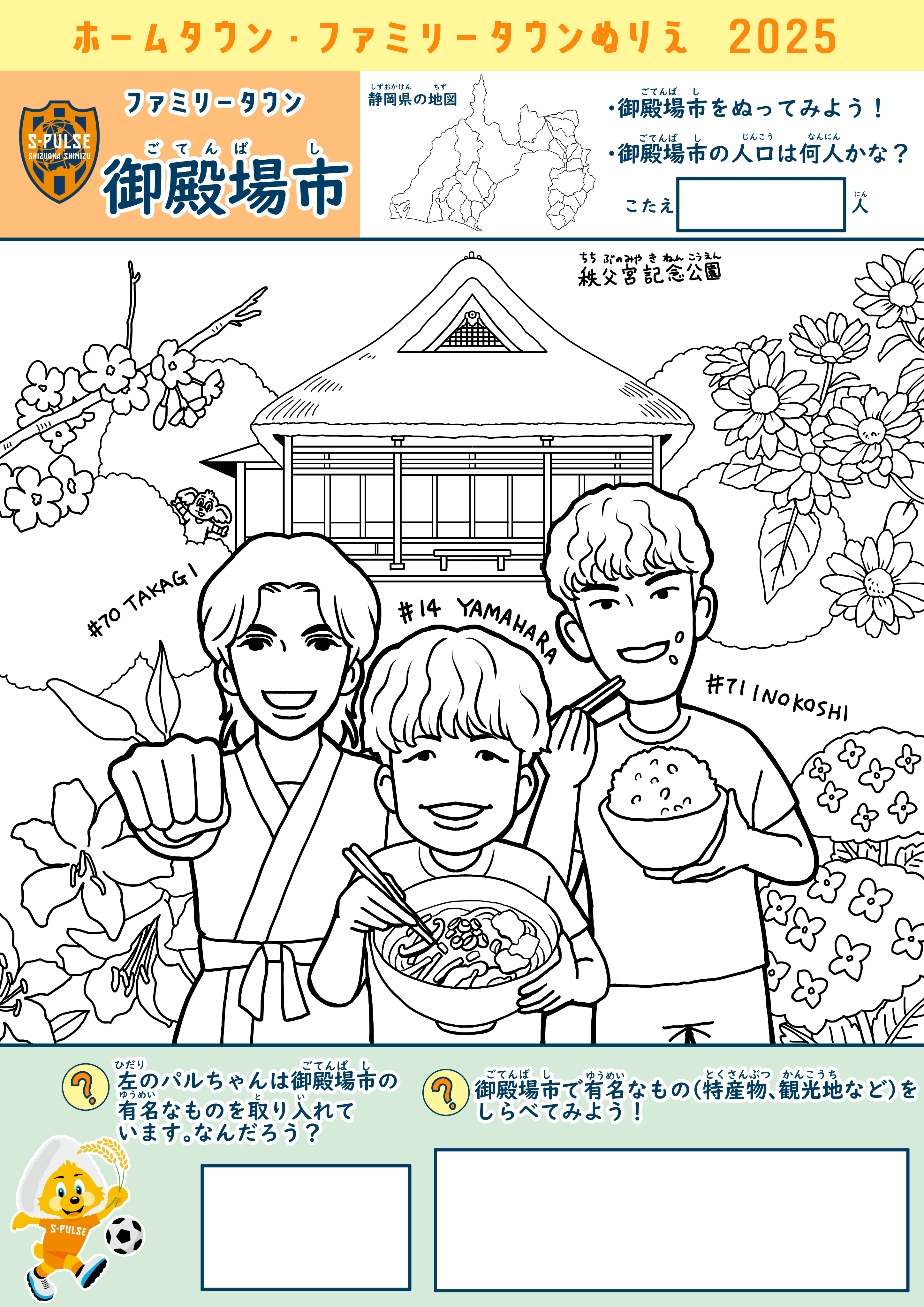 ぬり絵には各市町の人口や特産物・観光地などを記入する欄も設けています。ぜひホームタウン、ファミリータウンをもっと知り、たくさんの人にエスパルスのある街を身近に感じていただけたら嬉しく思います。