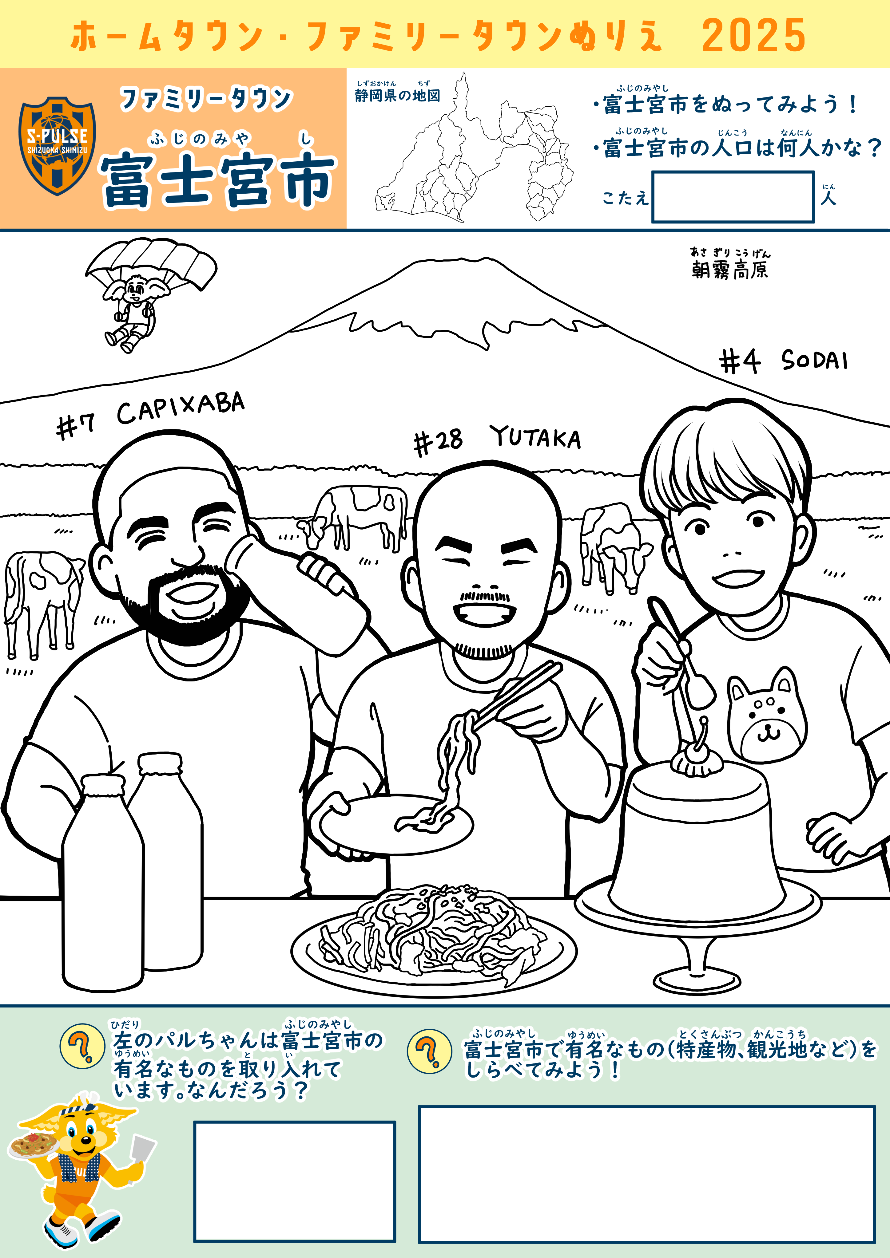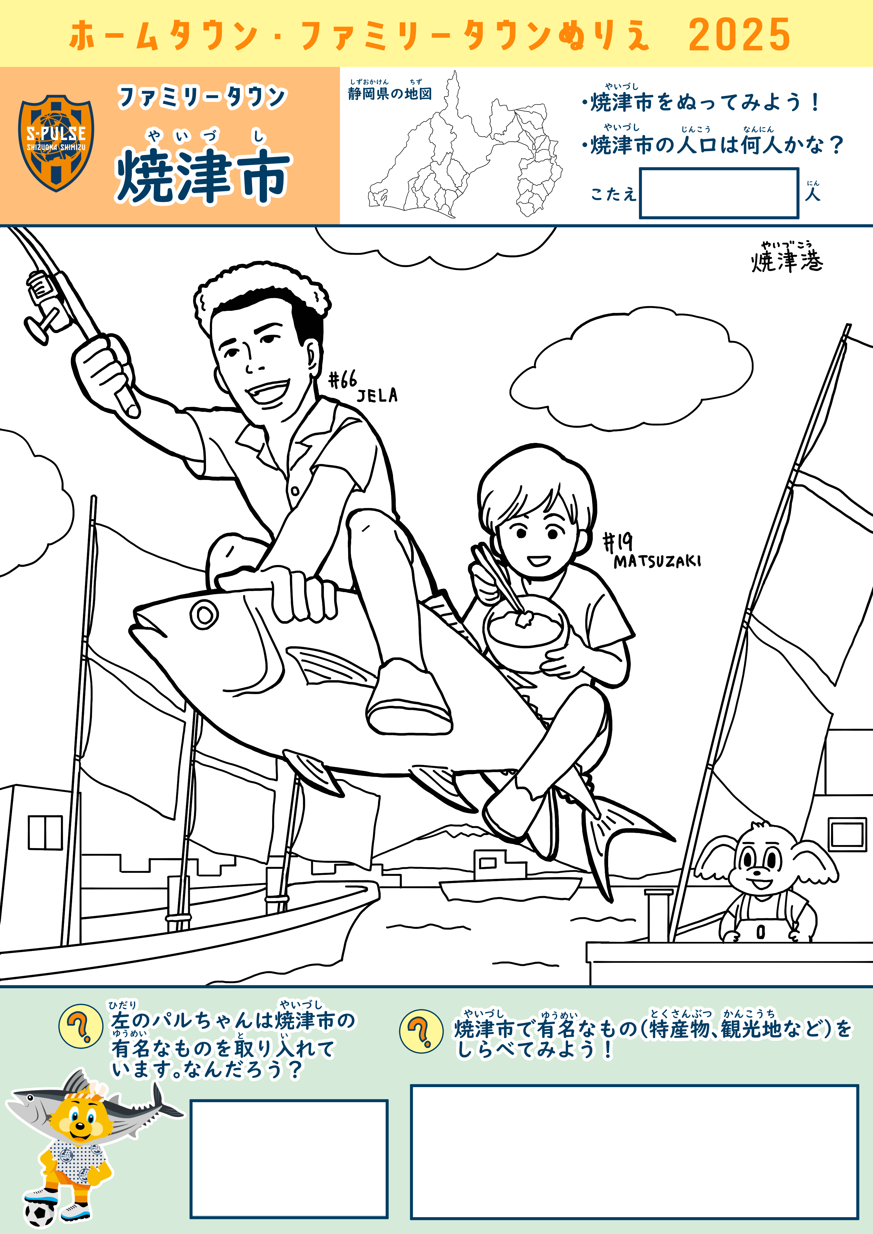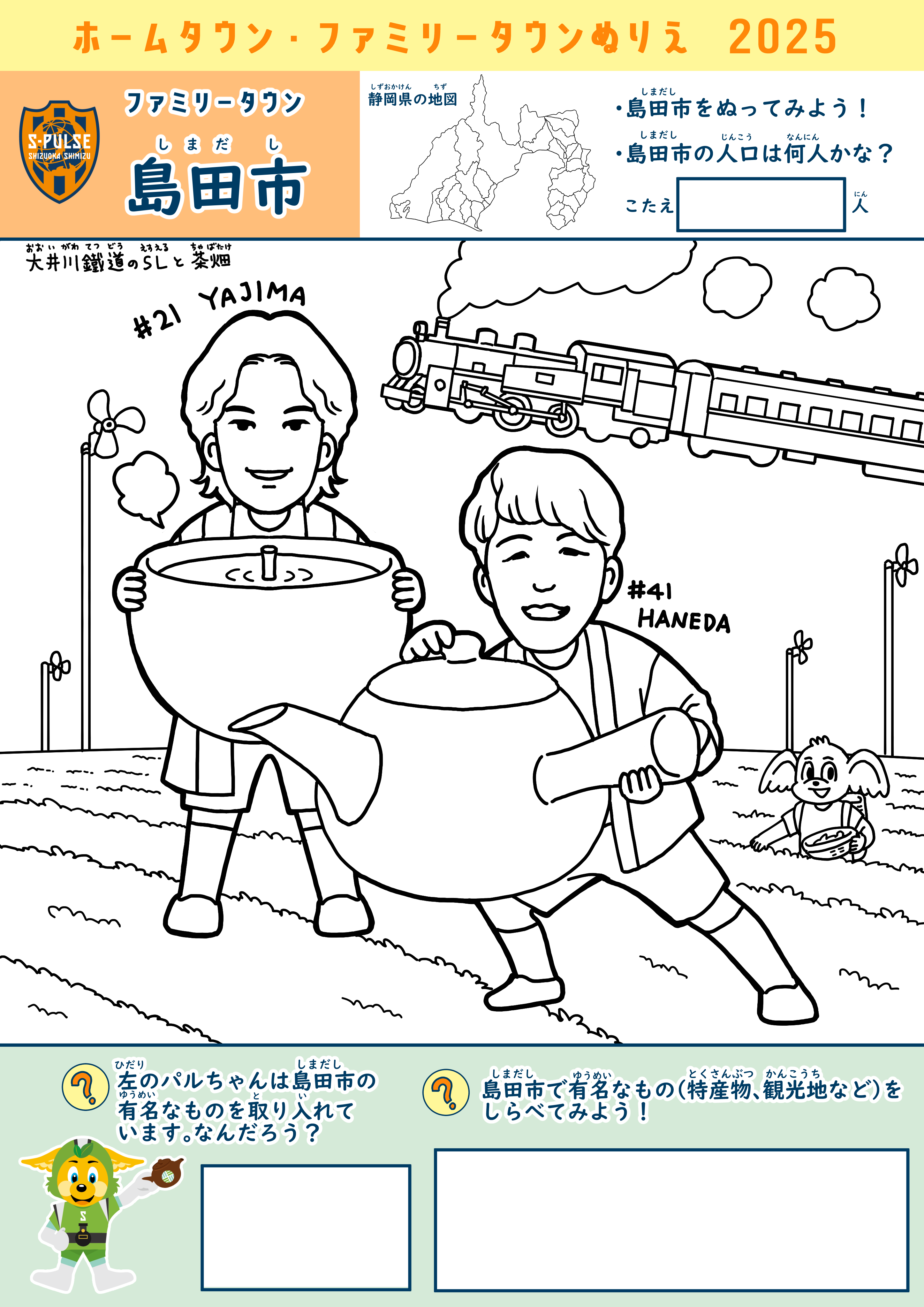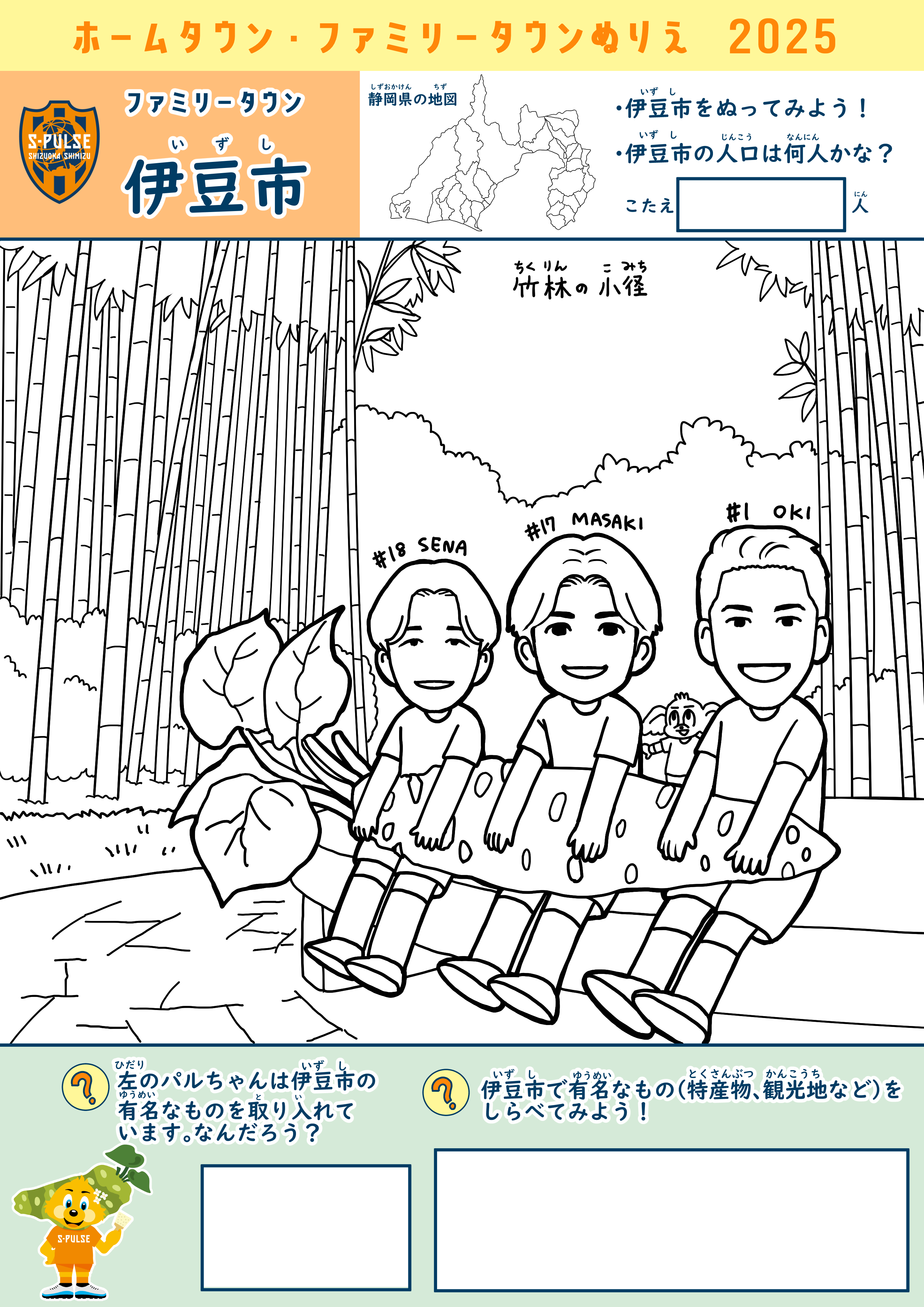 ぬり絵には各市町の人口や特産物・観光地などを記入する欄も設けています。ぜひホームタウン、ファミリータウンをもっと知り、たくさんの人にエスパルスのある街を身近に感じていただけたら嬉しく思います。