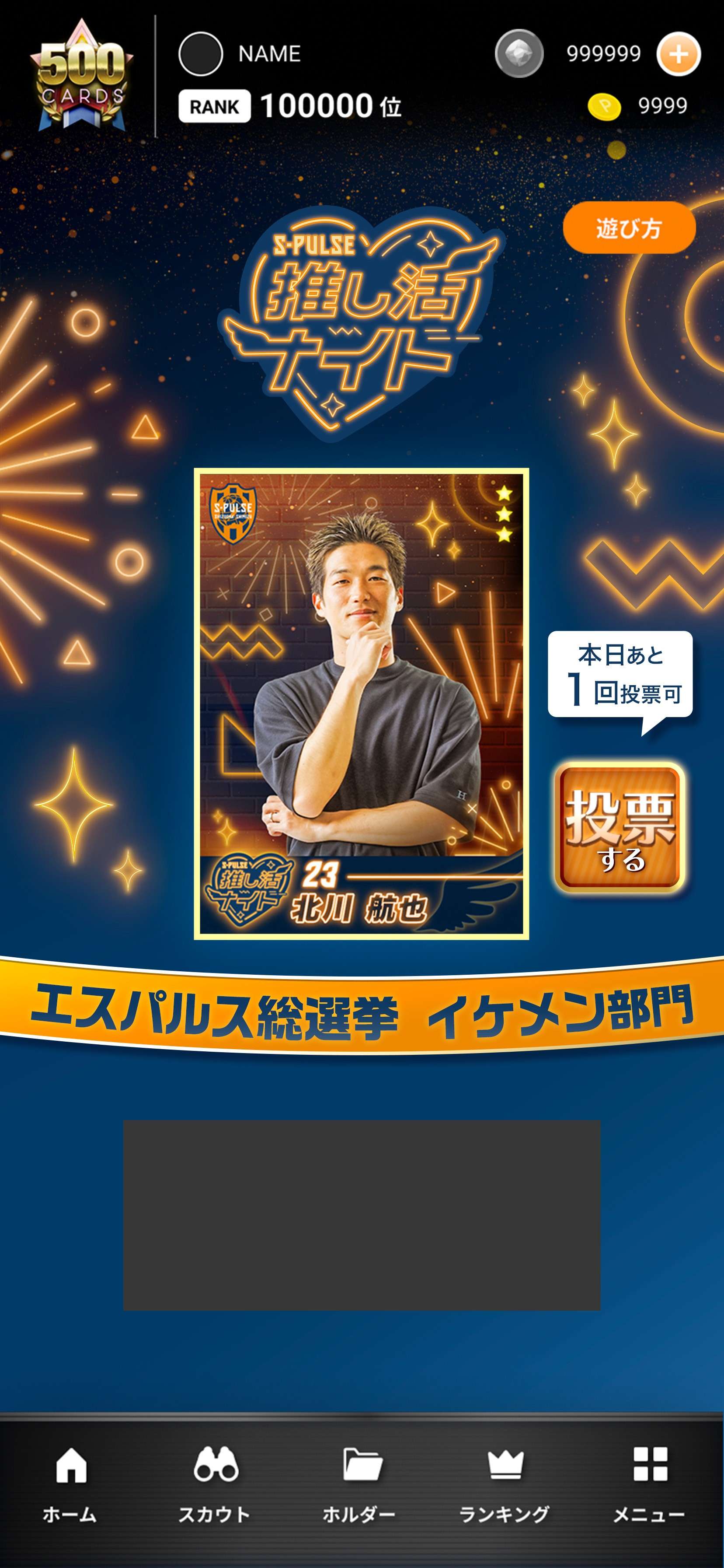 2025年8月31日(日)明治安田J1リーグ第28節鹿島アントラーズ戦にて実施される「推し活ナイト」のメイン企画である、エスパルス総選挙にて、「イケメン部門」のWEB投票を本サービス独占で実施いたします。毎日1票を無料で投票できます。さらにコイン、ダイヤいずれかによるスカウト10回につき、1日あたり上限1回まで追加の投票権をプレゼント!”推し”選手を上位に押し上げられるよう、毎日忘れずに投票しましょう。