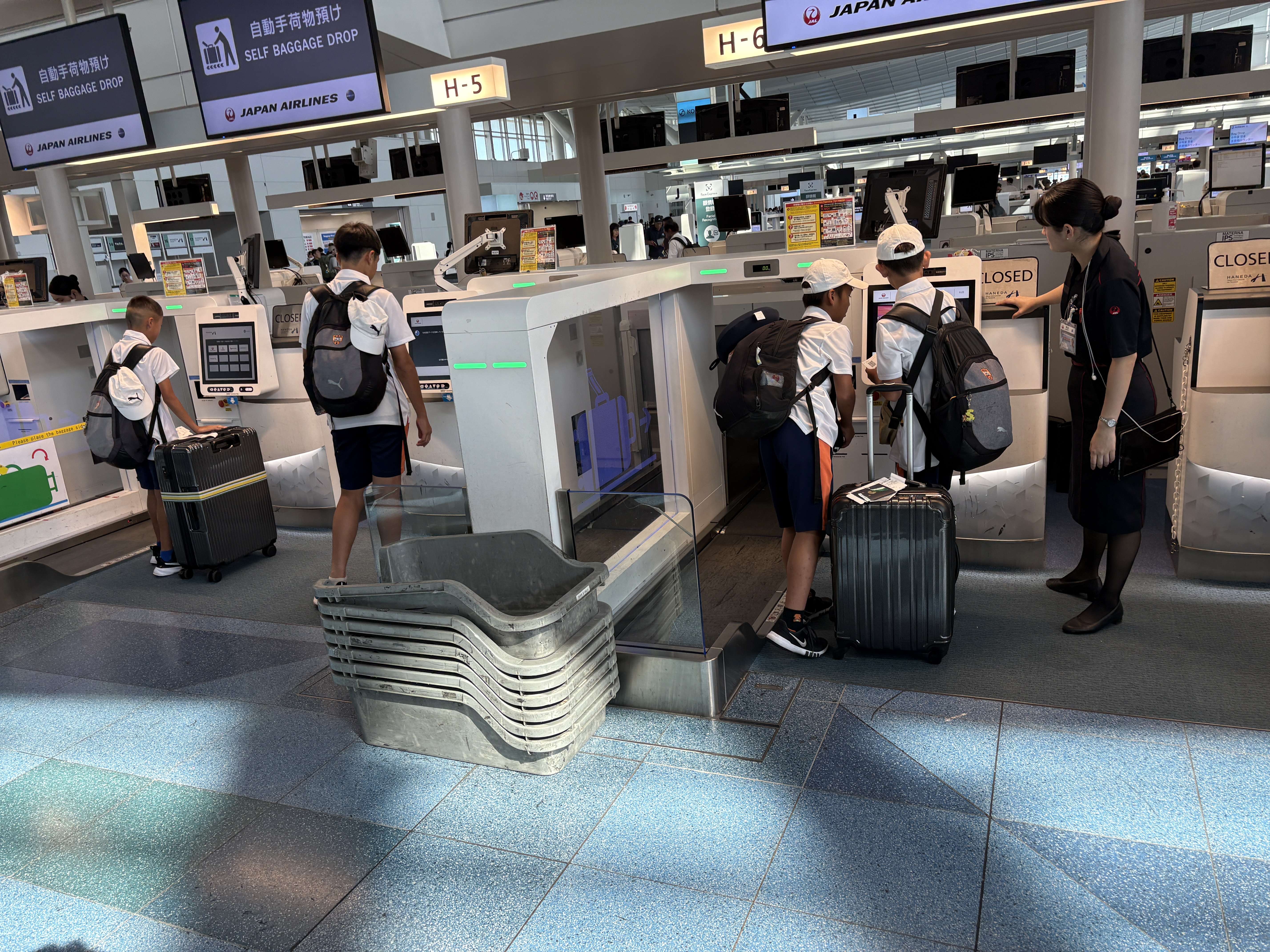 搭乗手続きを無事終えると安堵の表情を浮かべ、選手たちにとって冒険のような遠征が始まりました。