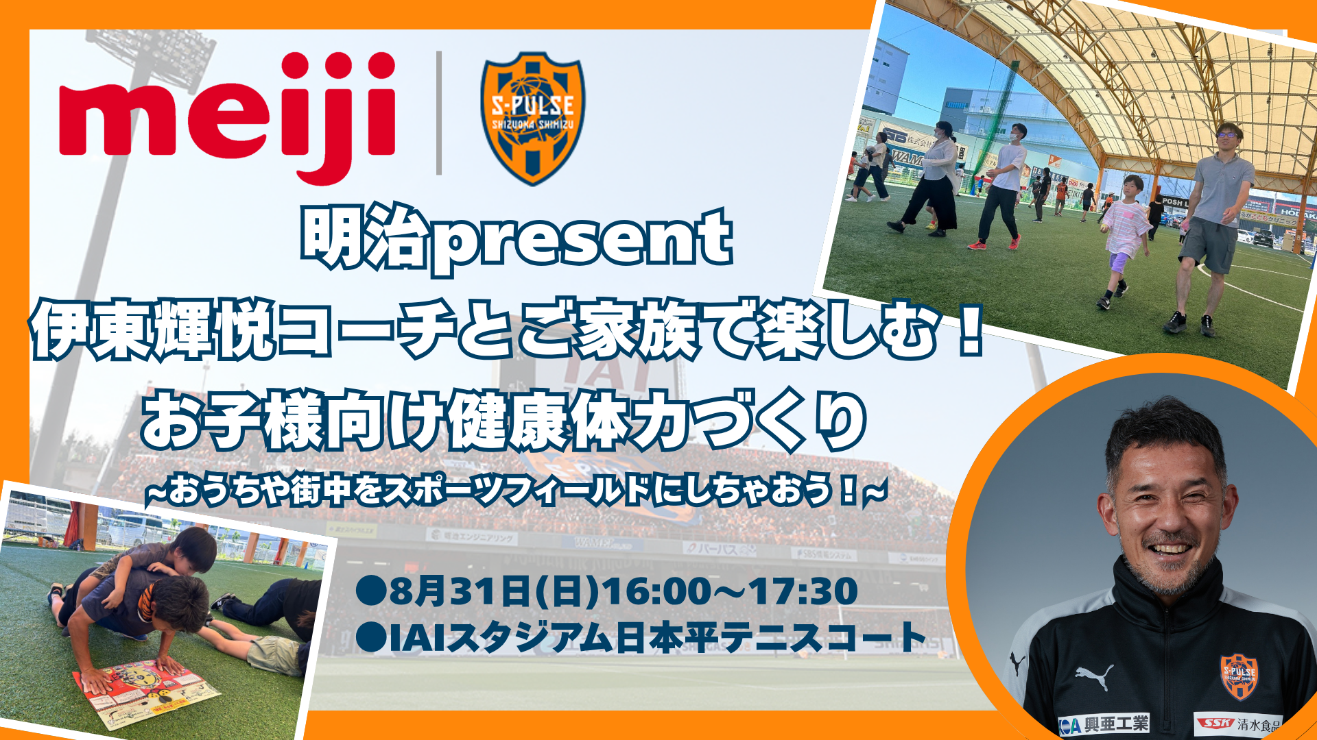 8/31(日)鹿島アントラーズ戦にて、IAIスタジアムテニスコートで株式会社明治様ご協力のもと、「ご家族で楽しむ健康イベント」として、明治present「伊東輝悦コーチご家族で楽しむ!お子様向け健康体力づくり ~おうちや街中をスポーツフィールドにしちゃおう!」を 開催しますので、下記の通りお知らせいたします。