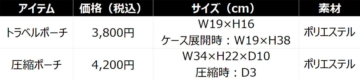 荷物をコンパクトにまとめられ、ケースと広げるとバスルームのフックなど吊るして使えるトラベルポーチと、かさばる衣類を小さいサイズに圧縮できるポーチが登場!どちらも機能性が高く、旅行や遠征で活躍すること間違いなし!