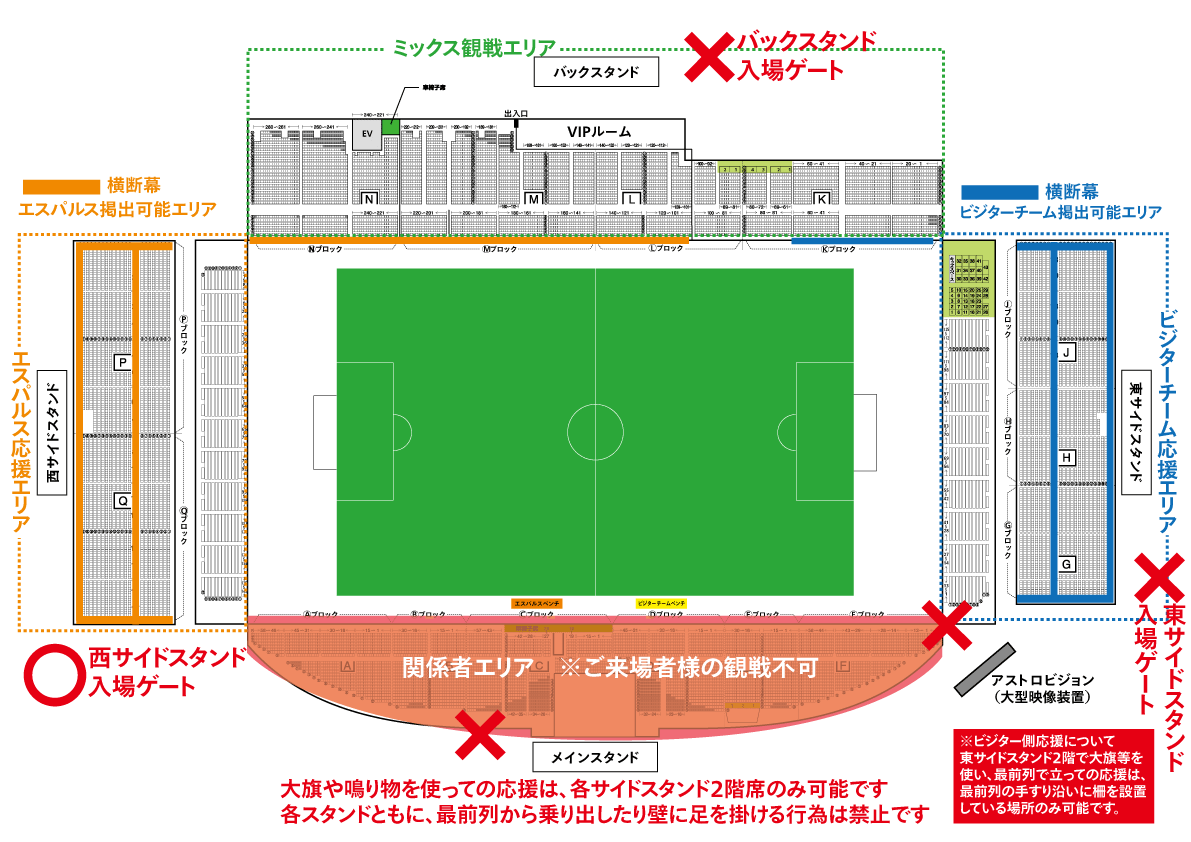 ・大旗や鳴り物を使っての応援は、各サイドスタンドの2階席のみ可能です。