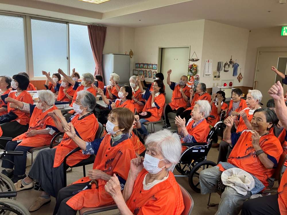 施設の職員の方にもエスパルスサポーターがいらっしゃり、会場はオレンジ1色。パルちゃんの登場に皆さんが歓声をあげていました。パルちゃんと一緒に踊ったグリコは大盛り上がり。数分間の練習でも、皆さんグリコをマスターしていました。88名と大変多くの皆さんにエールをいただきました。