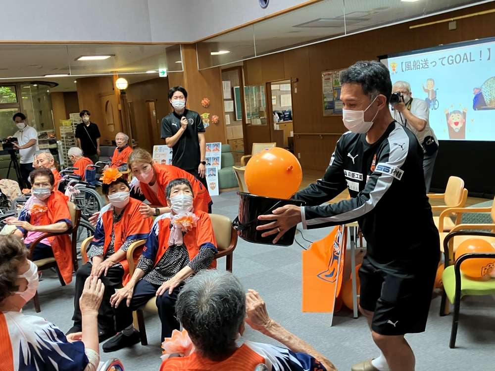 「オレンジのシャツを着ると、元気が出るね」とエスパルスカラーのシャツを着ると自然と笑顔が溢れてきました。風船レクリエーションでは、みなさんでパスをつないで伊東アンバサダーが持つかごにゴール!チャレンジが成功するたびに歓声が上がりました。