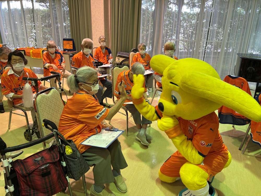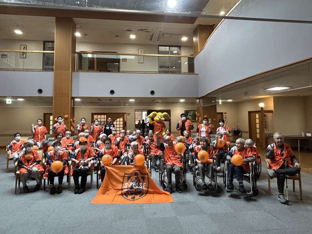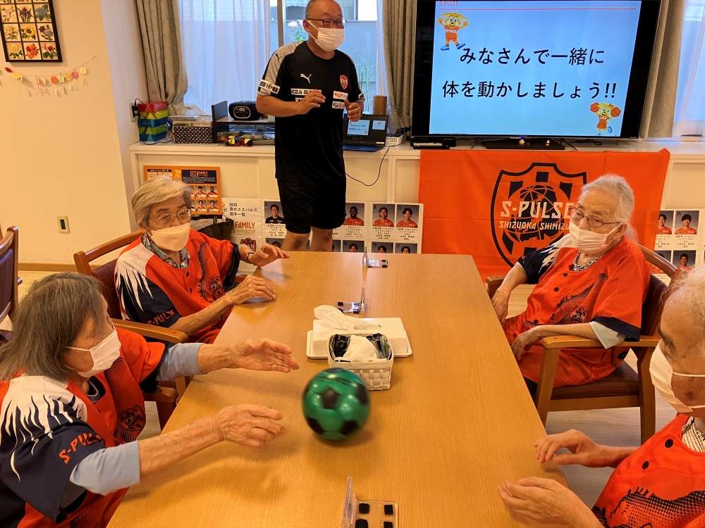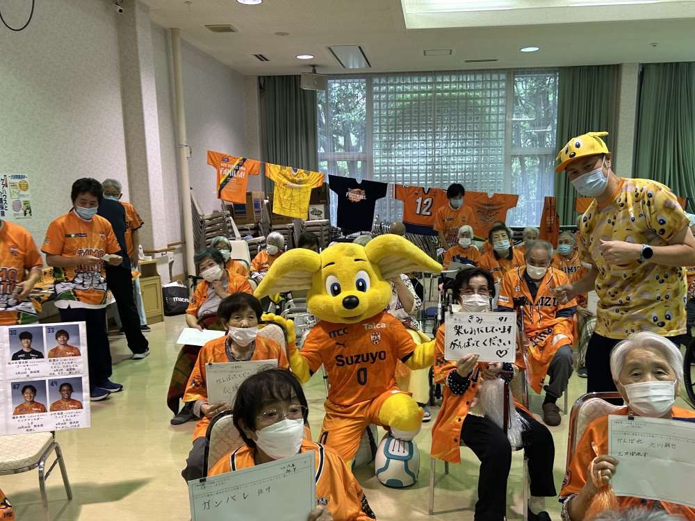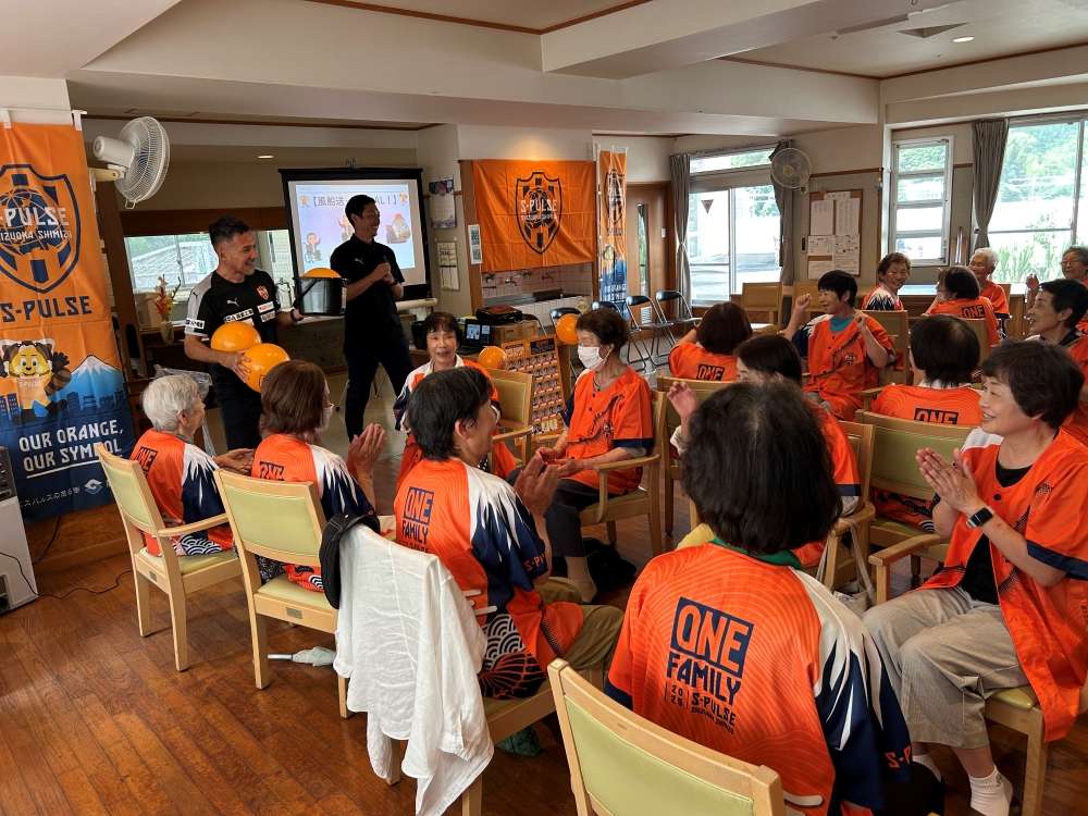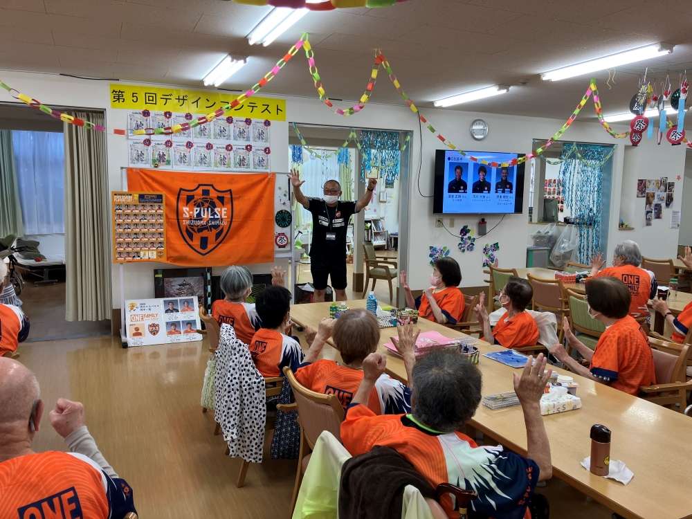 実施に向けて、エスパルスマスコットキャラクター パルちゃん、エスパルスダンススクール生、伊東輝悦 アンバサダー兼教育事業部コーチ、打桐始 教育事業部コーチ(ライフキネティック公認パーソナルトレーナー)、ホームタウン事業部・教育事業部コーチ・スタッフが施設を訪問し、高齢者の皆さまとふれあい、エールを記入いただきました。また、高齢者の皆さまに練習見学にお越しいただき、選手と交流を深めました。