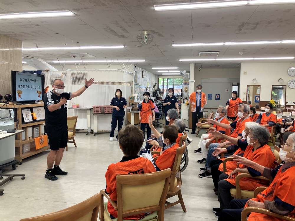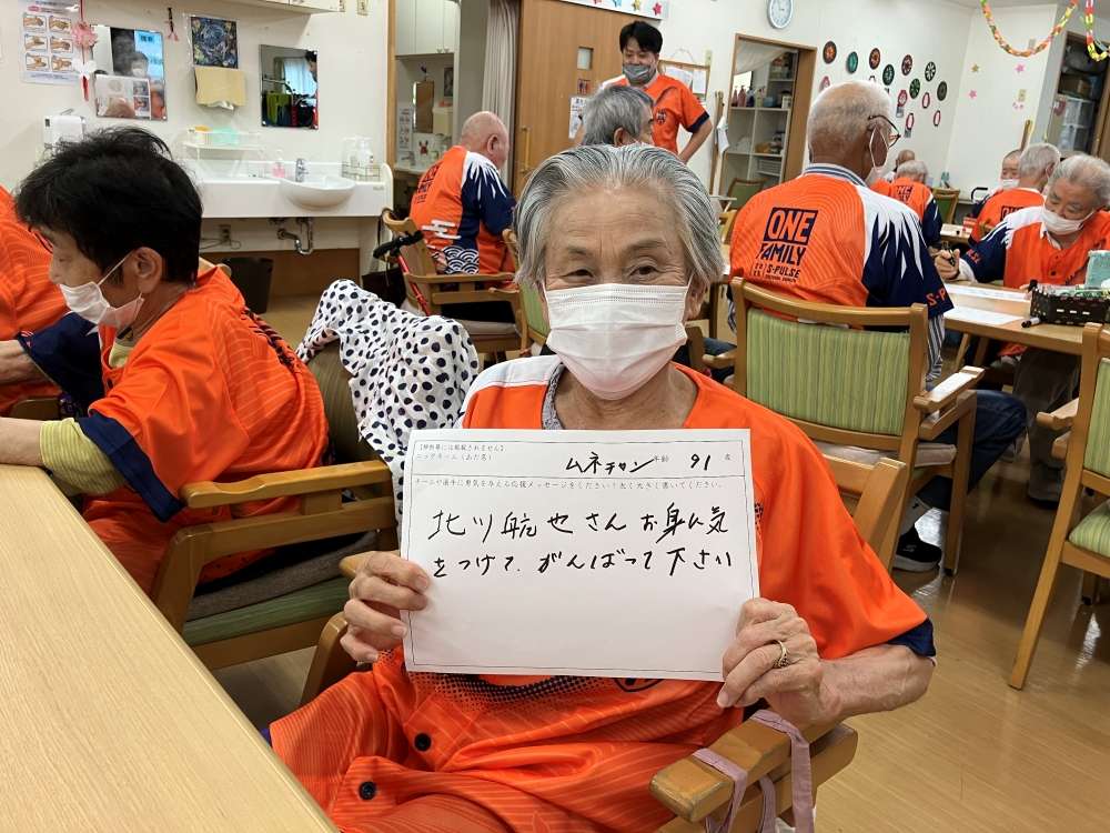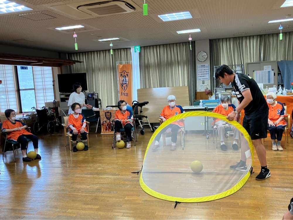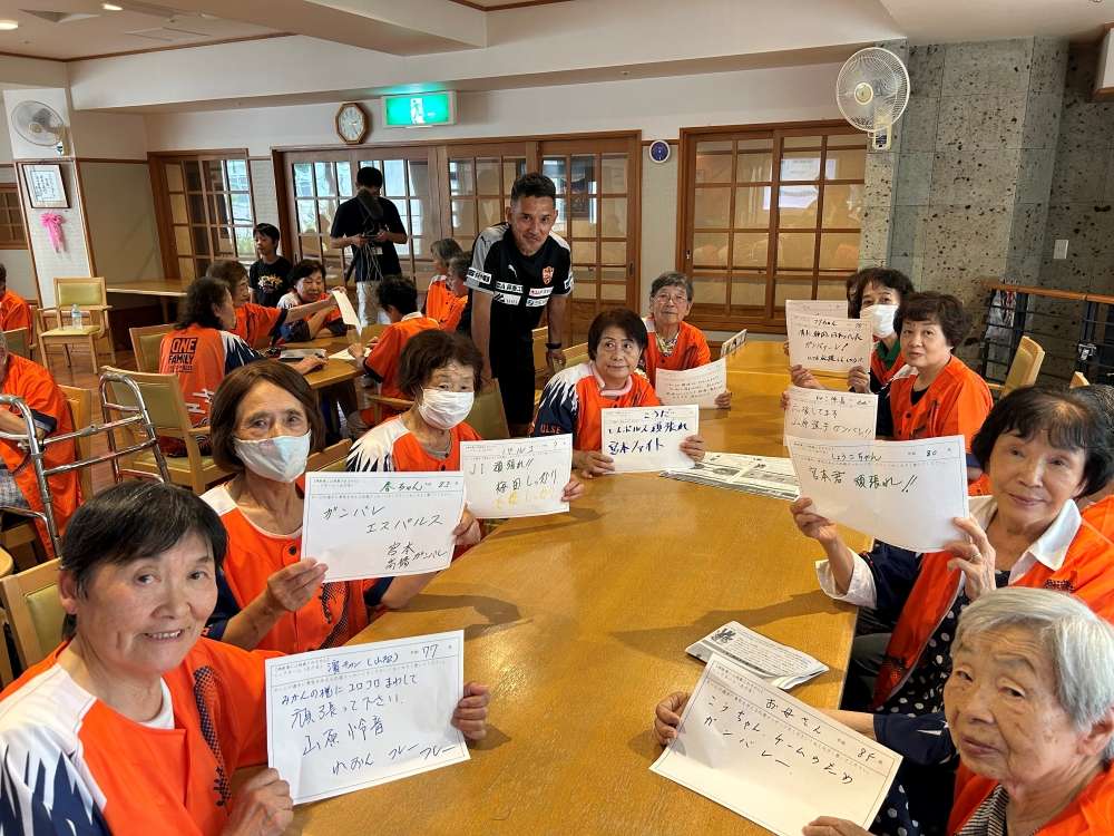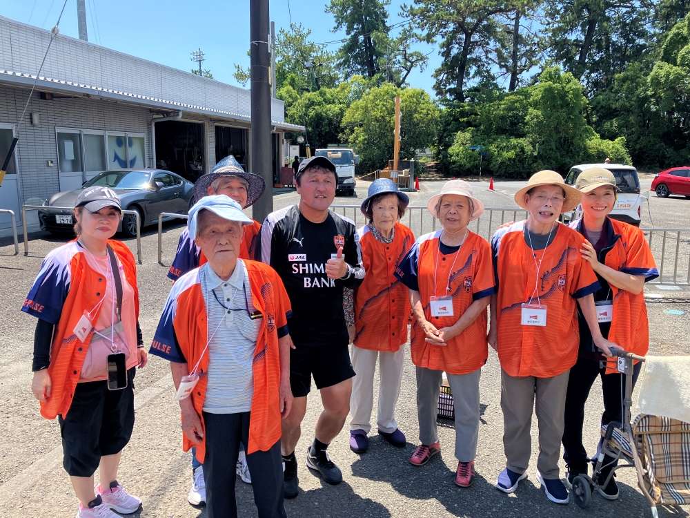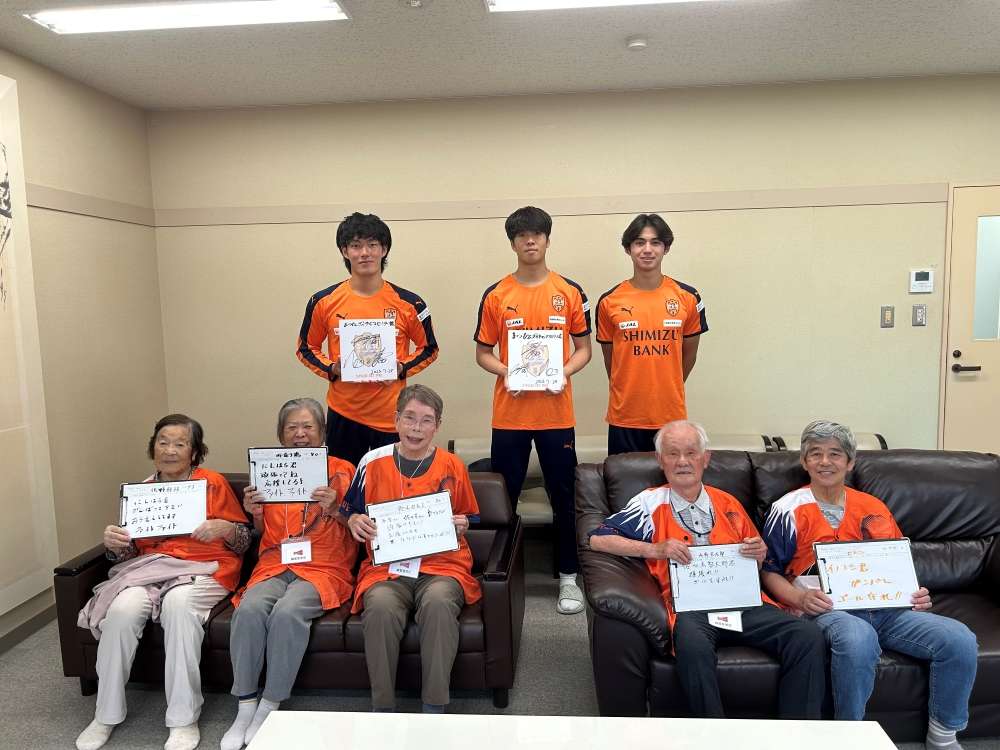 実施に向けて、エスパルスマスコットキャラクター パルちゃん、エスパルスダンススクール生、伊東輝悦 アンバサダー兼教育事業部コーチ、打桐始 教育事業部コーチ(ライフキネティック公認パーソナルトレーナー)、ホームタウン事業部・教育事業部コーチ・スタッフが施設を訪問し、高齢者の皆さまとふれあい、エールを記入いただきました。また、高齢者の皆さまに練習見学にお越しいただき、選手と交流を深めました。