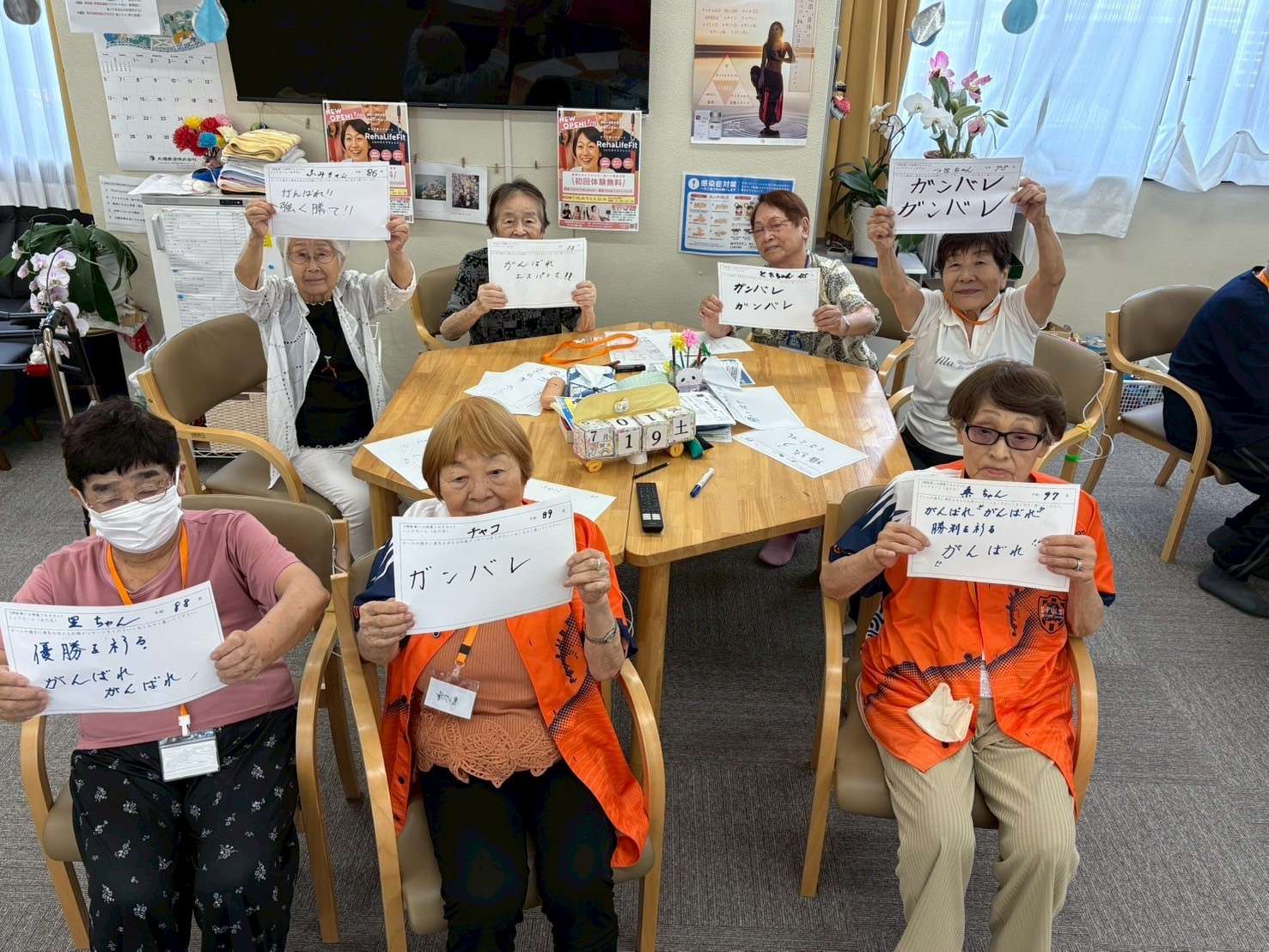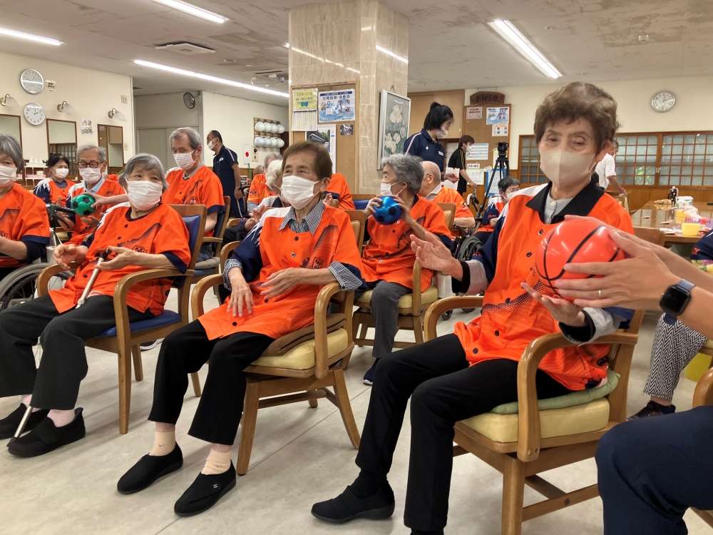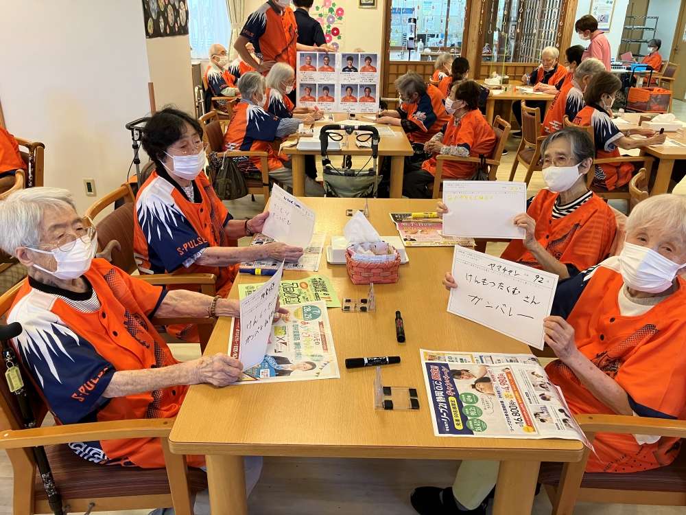 打桐コーチによる運動教室と合わせて企画を実施しました。ボールを使った運動はテーブルごとに実施。終盤にはチームワークも生まれ、楽しみながら頭と身体を使うことができました。エールをいただいた方の中で、最高齢はなんと101歳。選手一覧から、推しの選手を見つけてエールを書いてくださいました。