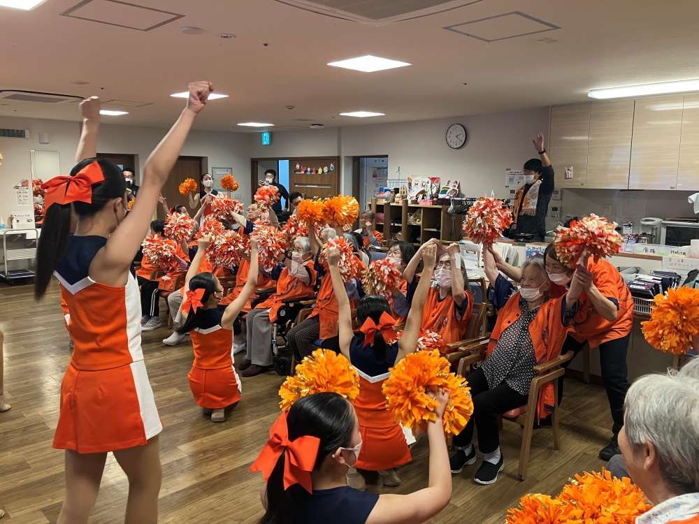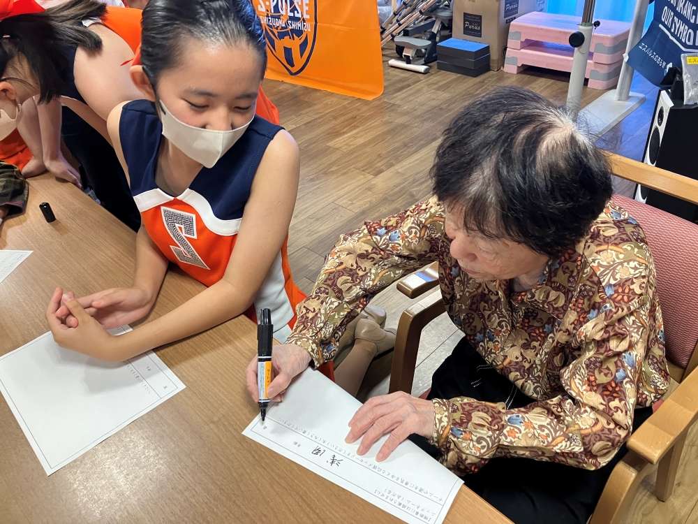 エスパルスダンススクールの生徒も駆けつけ、ダンスを披露したり施設のみなさんと一緒に踊ったりして楽しい時間を演出してくれました。エールを記入する時間も、スクール生と一緒に推しの選手は誰かと、楽しくお話をしながらメッセージを書いていただきました。