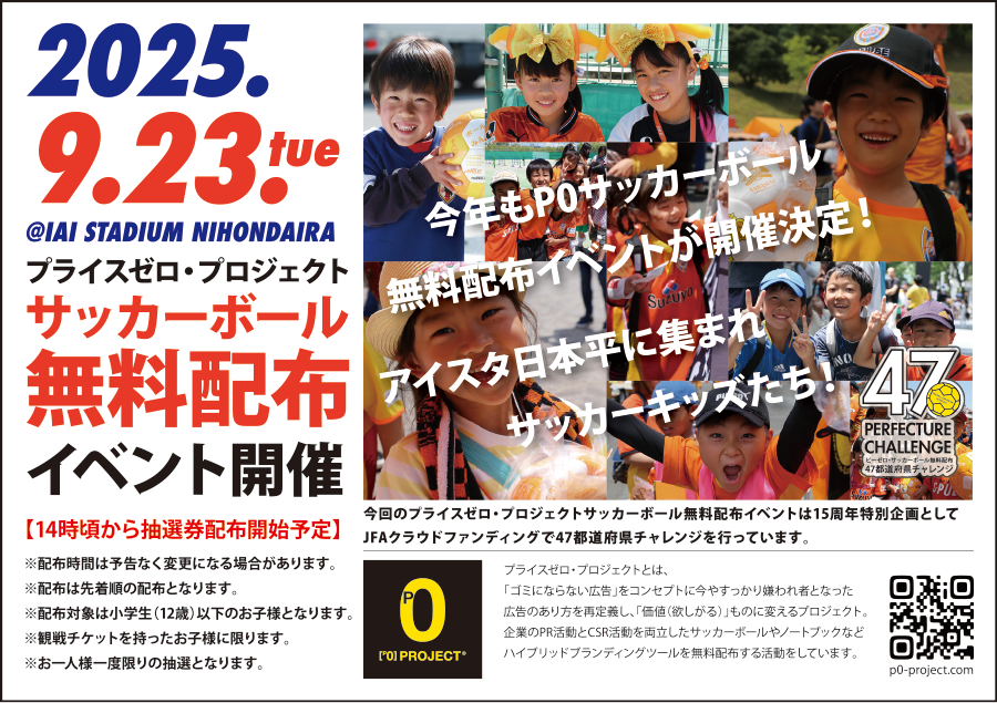 9月23日(火祝)浦和レッズ戦では、プライスゼロ・プロジェクトとして、来場した子どもたちにサッカーボールをプレゼントします!