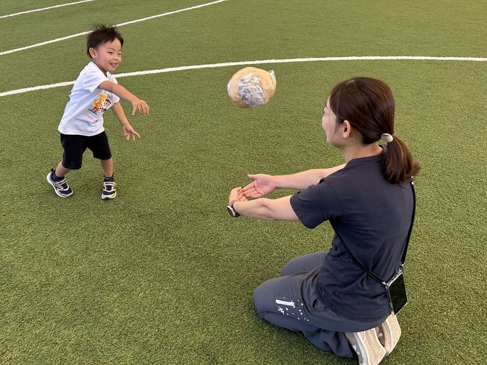 作ったボールを「なげる」・「とる」といった動作を必要とするキャッチボールや、ボールを「ける」・「わたす」動作が主となるシュート練習などを行います。最後はボールを使ったサッカー対決を親子で実施し、ゲーム形式の中で楽しく運動する機会を創出します。