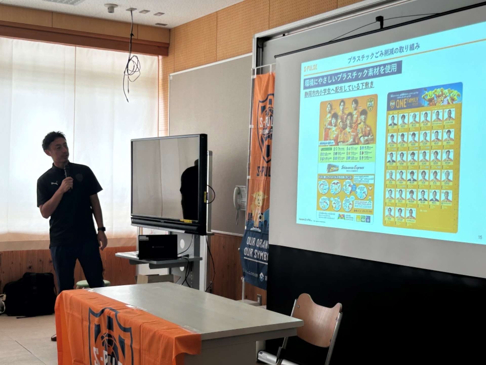 その後エスパルスが行っている地域貢献活動や環境への取り組みについて説明を行いました。どうしてエスパルスが環境問題に取り組む必要があるのかを説明し、脱プラスチックに向けたさまざまな取り組みや、環境にやさしいプラスチック素材を利用した下敷きの作成・配布、海岸清掃や三保松原の保全への参加など、エスパルスが実施している活動や選手からのメッセージを紹介しました。