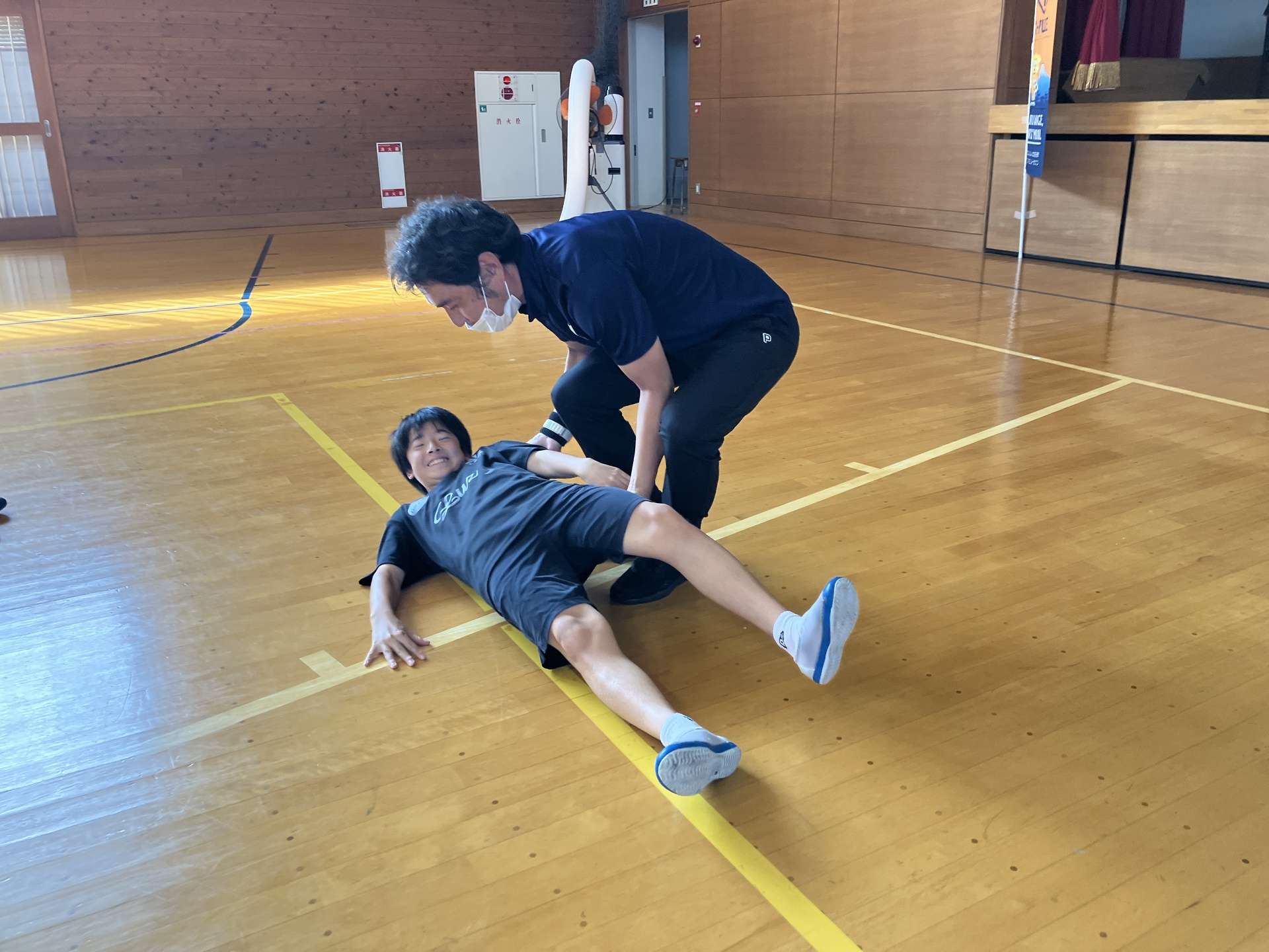 仕事をする上で必要なチカラの話では、4つの大切なチカラをあげ、その中でも『課題発見力』の大切さについて、「現状のままでは成長はしない。もっともっと良くなるためには、新しい壁を自ら作り、それを乗り越える努力を続けてくこと」と説明しました。途中で育成年代の選手の練習でも取り入れている、体幹トレーニングを体験したりもしました。