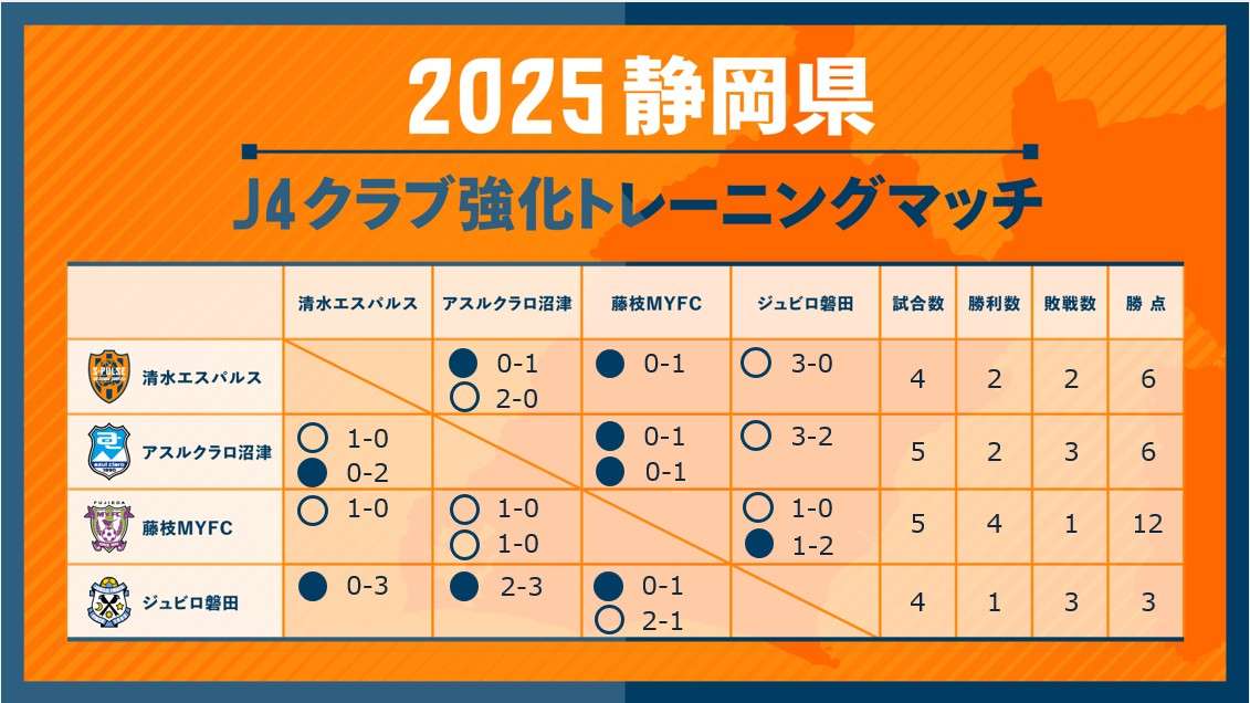 本日行われました静岡県J リーグ加盟4クラブ強化トレーニングマッチ(アスルクラロ沼津vs清水エスパルス)の結果をお知らせいたします。