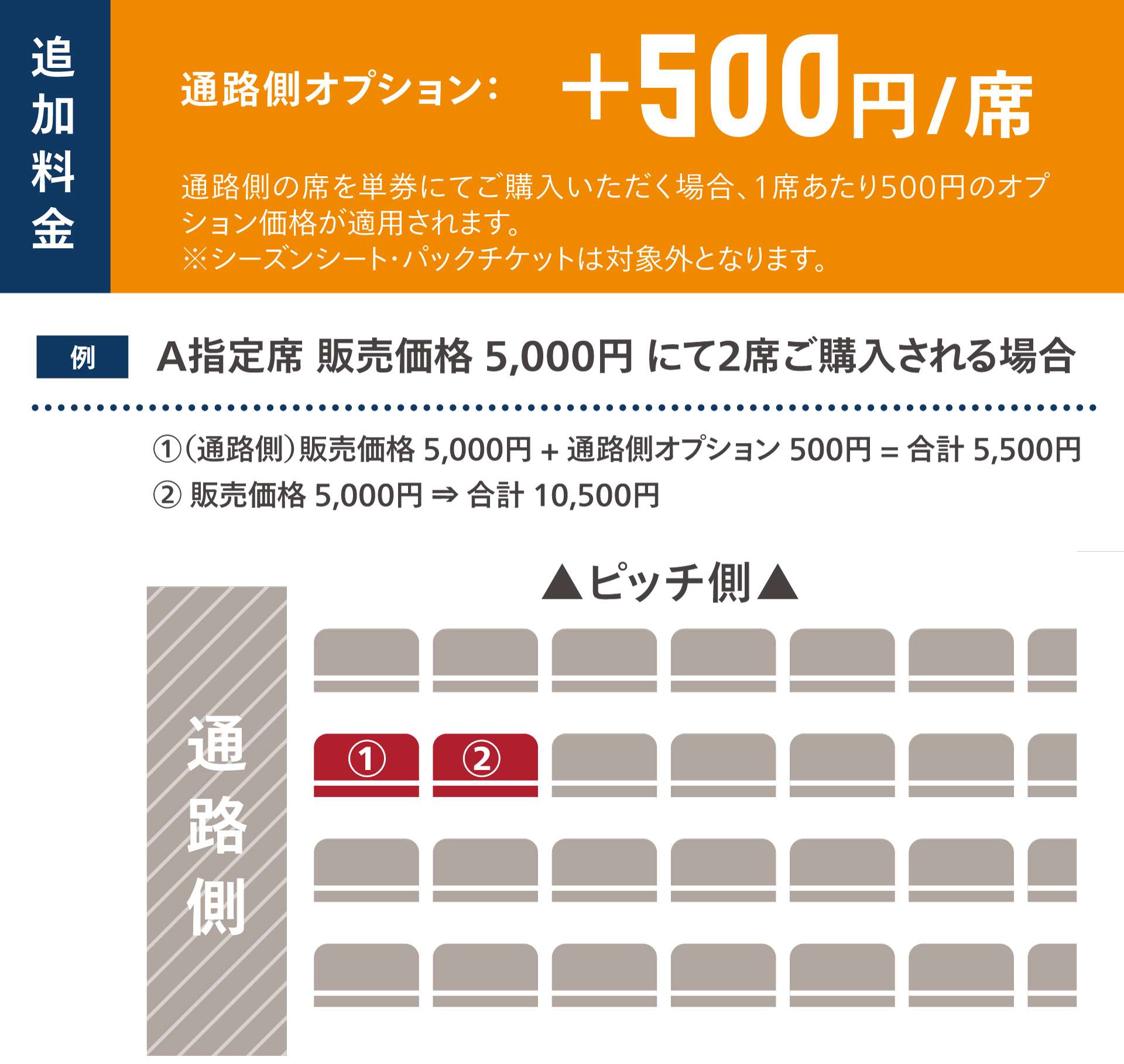 「明治安田J1百年構想リーグ」より、試合毎の単券販売において「通路側オプション」を設定させていただきます。各ブロックの通路側のお席をご購入される場合、オプション価格(+500円)が上乗せされます。