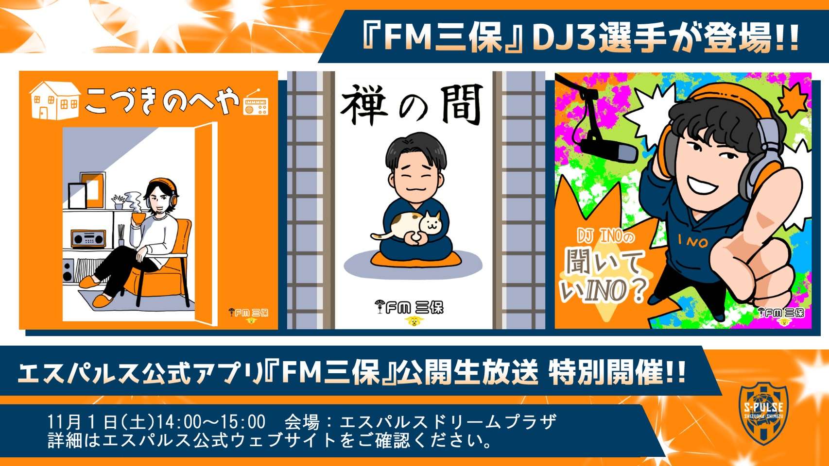 11月1日(土)、エスパルスドリームプラザにて、エスパルス公式アプリコンテンツ『FM三保』の公開生放送を実施いたします。『FM三保』は、小塚和季選手、猪越優惟選手、宇野禅斗選手の3選手がDJとなり、三保クラブハウスでのチームの様子をゲスト選手を招いて“ラジオ感覚”でトークをし、お聴きいただいている皆さまも“ラジオ感覚”で楽しめる音声コンテンツです。選手同士の軽快なトークや練習裏話、スタッフとのやりとりなど、普段は見られない素顔がたっぷり。まるで三保にいるような臨場感で、エスパルスの“今”をお届けしています。そんな『FM三保』を今回は特別に公開生放送いたします!!ぜひ、3選手のトークをお楽しみください。