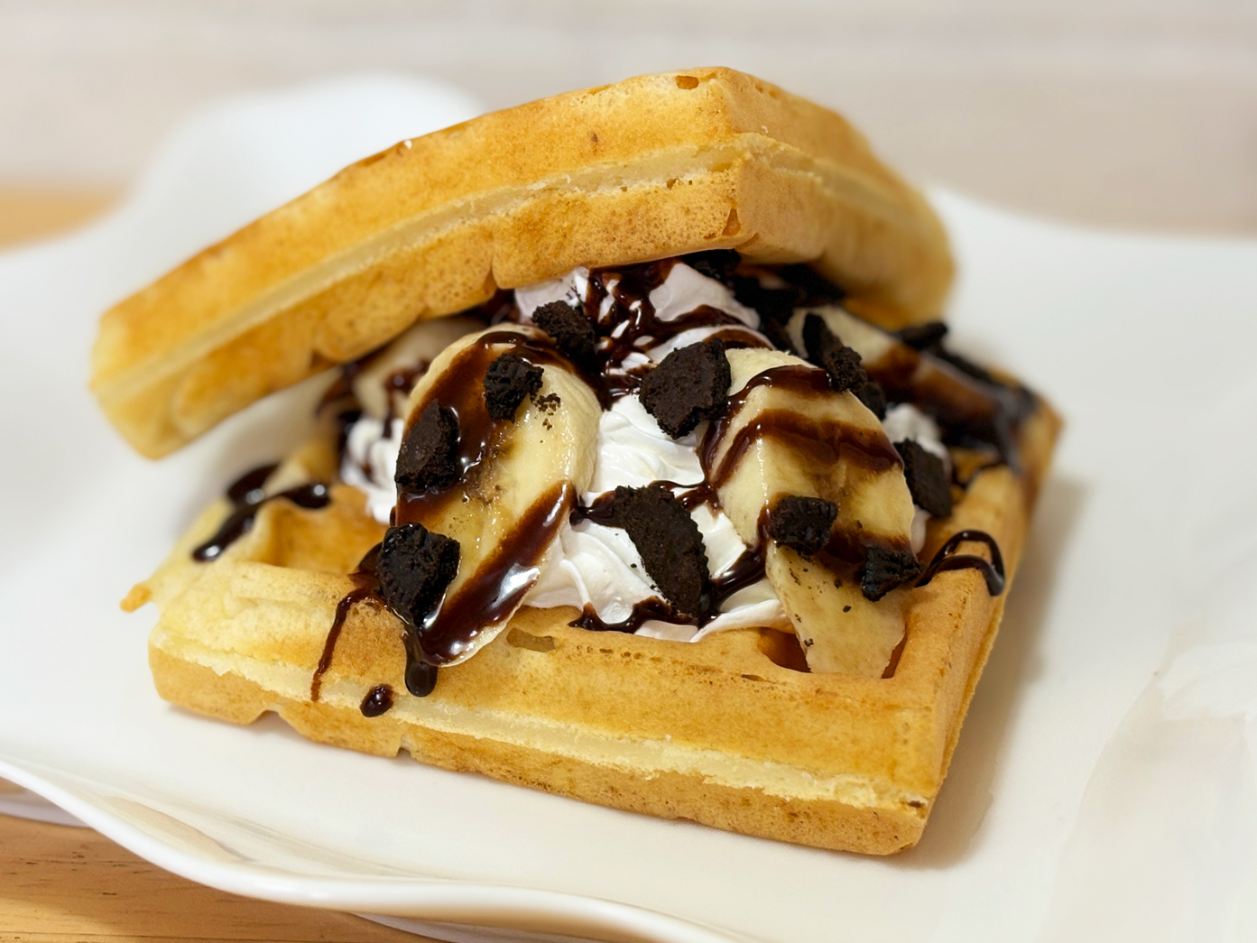 ふわふわのワッフルに、定番のチョコとバナナとクリーム、そしてザクザクのココアビスケットをサン