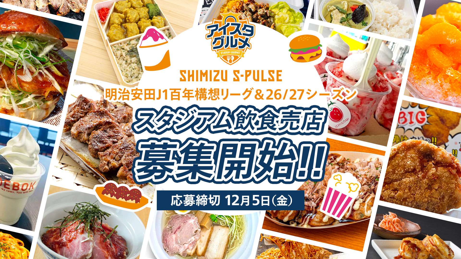 エスパルスでは、2026/2027シーズンのスタジアム飲食売店に出店いただける飲食売店を、下記の通り募集します。ご来場いただいた皆様に喜ばれるスタジアムグルメを提供していただける店舗様のご応募をお待ちしております。