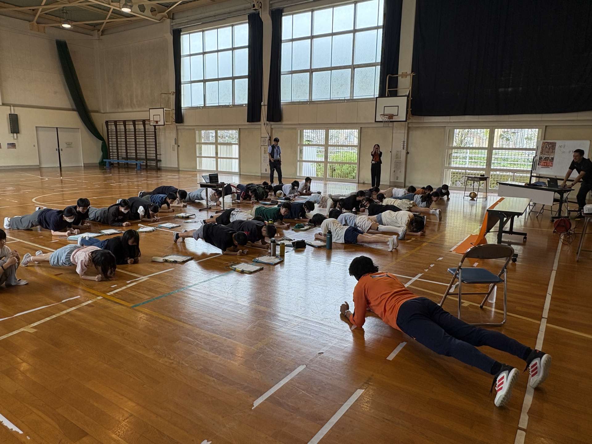 次に、「シュートと理科の関係」では、身体の構造や、サッカーに必要な筋肉について学びました。「サッカーをやる中で特に大切な筋肉はなんでしょう。」という質問に対して、小学生からは、「足」「ふくらはぎ」などの声があがりましたが、小塚選手からの答えは「体幹」でした。体幹を鍛えることの必要性を小塚選手が解説した後は、小塚選手が練習の日に行っている体幹トレーニングを紹介してもらい、実際に全員で行いました。教えてもらったトレーニングの一つはプランクというトレーニングで、「ポイントは体をまっすぐにキープすること」と小塚選手から教えてもらい、みんなで20秒キープに挑戦しました。挑戦中は全身に力を込めて、みんな正しい姿勢を20秒間維持しようと頑張りました。子どもたちが選手と一緒に楽しくトレーニングを行う様子が見られました。