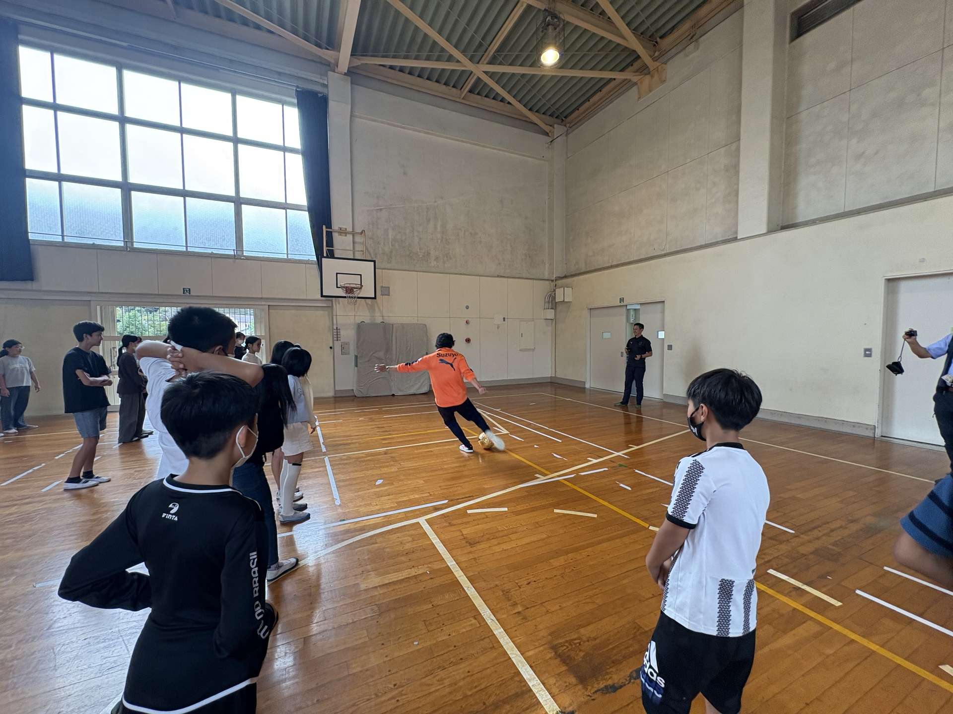 「シュートと算数の関係」では、ゴールまでの距離やボールの速さを知り、「みちのり÷速さ=時間」の公式を使って、PK時のGKの反応速度(時間)について考えました。シュート時のボールの速さを知るために、代表の生徒と小塚選手がシュートを披露しました。プロのボールスピードや衝撃音を目の前で体感した子どもたちからは、「速い!」「すごい!」など感嘆の声が上がりました。