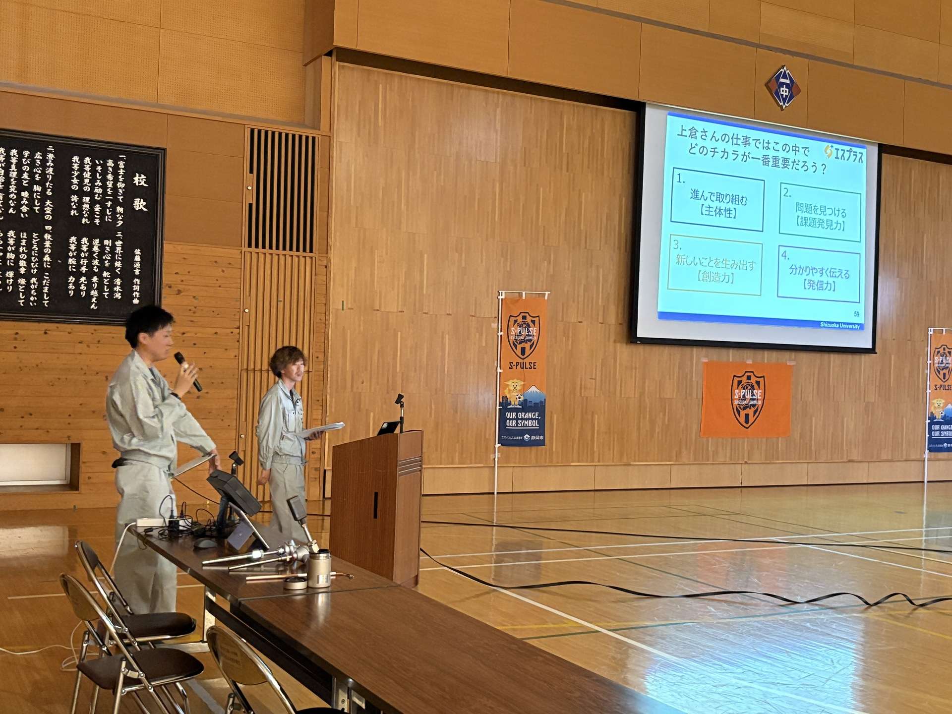 10月27日(月) 静岡市立清水第一中学校にて、クラブパートナーの明陽電機株式会社よりゲスト講師2名を迎え、『エスプラス』「地域貢献や社会に出て必要なチカラを考えるキャリア教育授業~モノづくり編~」を実施しました。