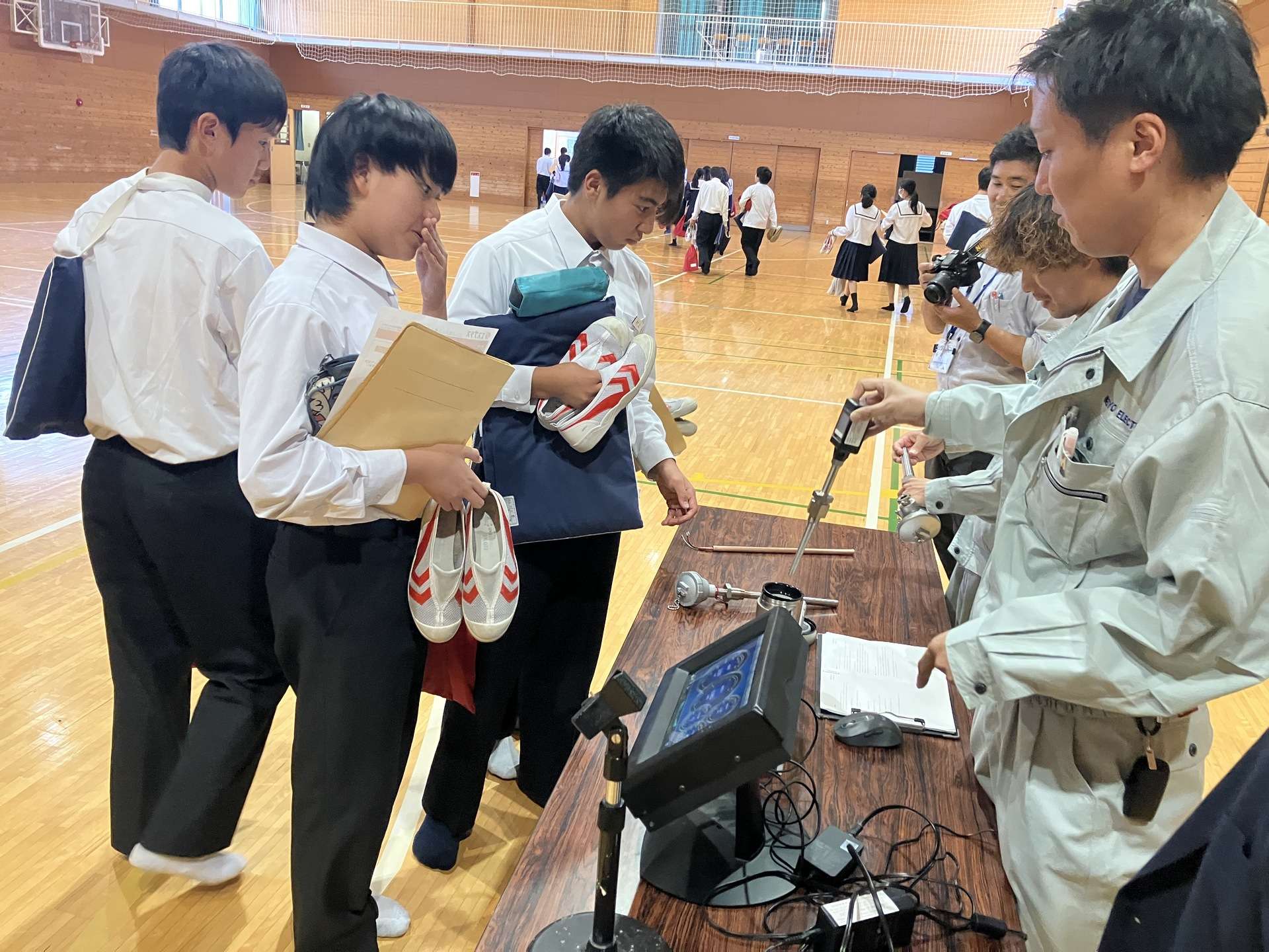 授業が終わって退場の際には、明陽電機の実物の製品を間近で見ることができました。普段は見ることができない船の部品を実際に手にとり、意外な重さに驚いたり、タッチパネルを触ってみたりして、生徒の皆さんは製品に興味津々の様子でした。