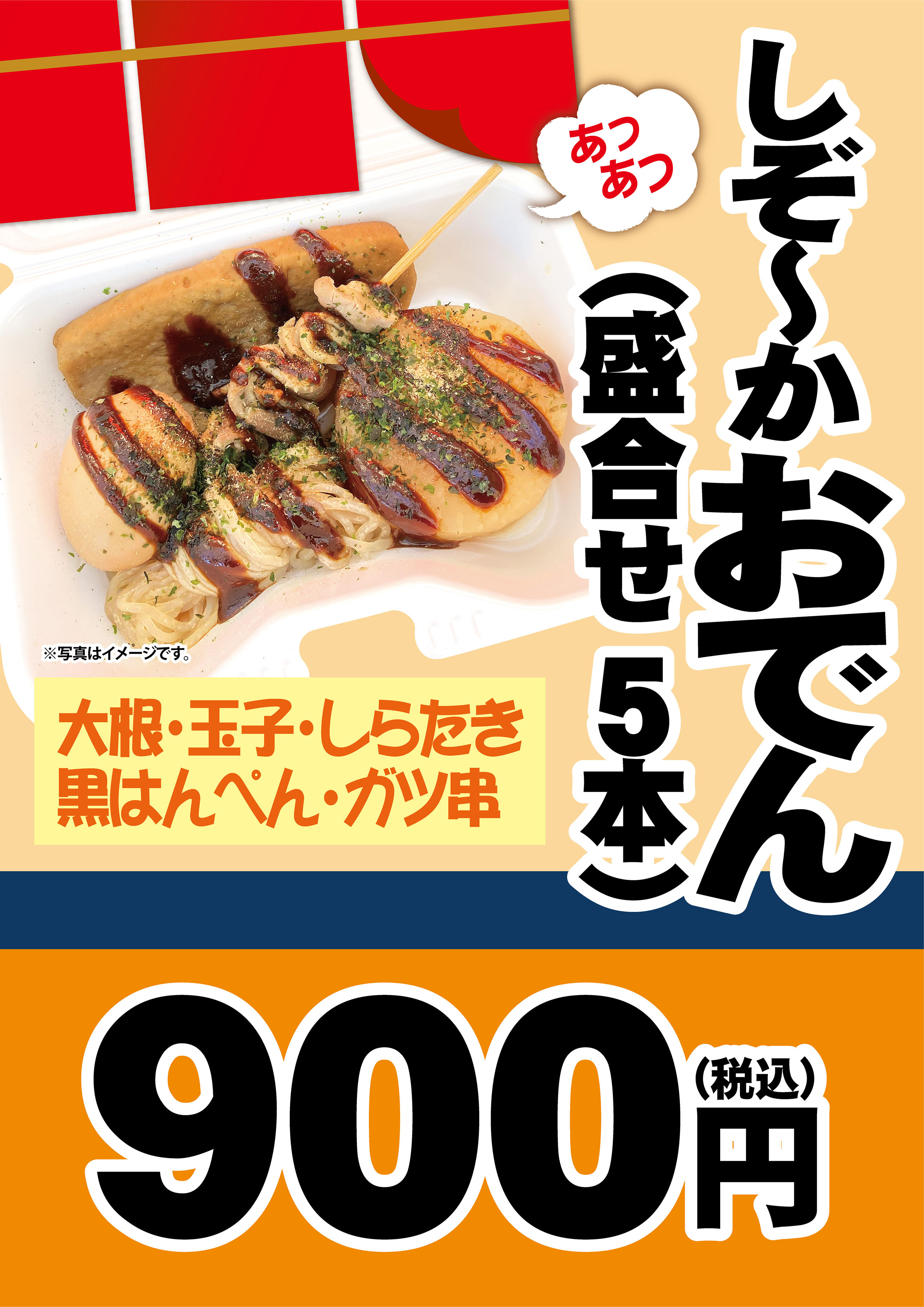 しぞ~かおでん盛合せ 5本 通常1,000円(税込)のところ特別価格900円(税込)※数量限定・売切御免!!
