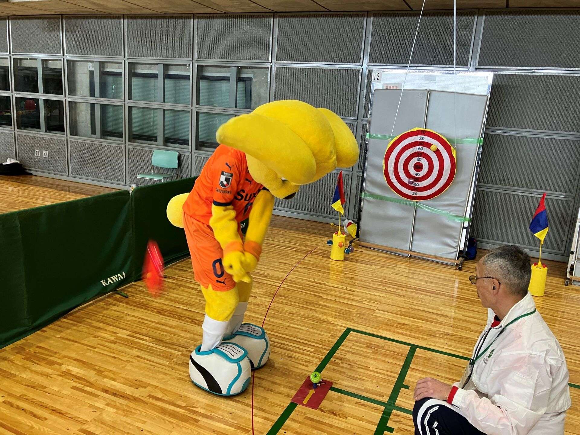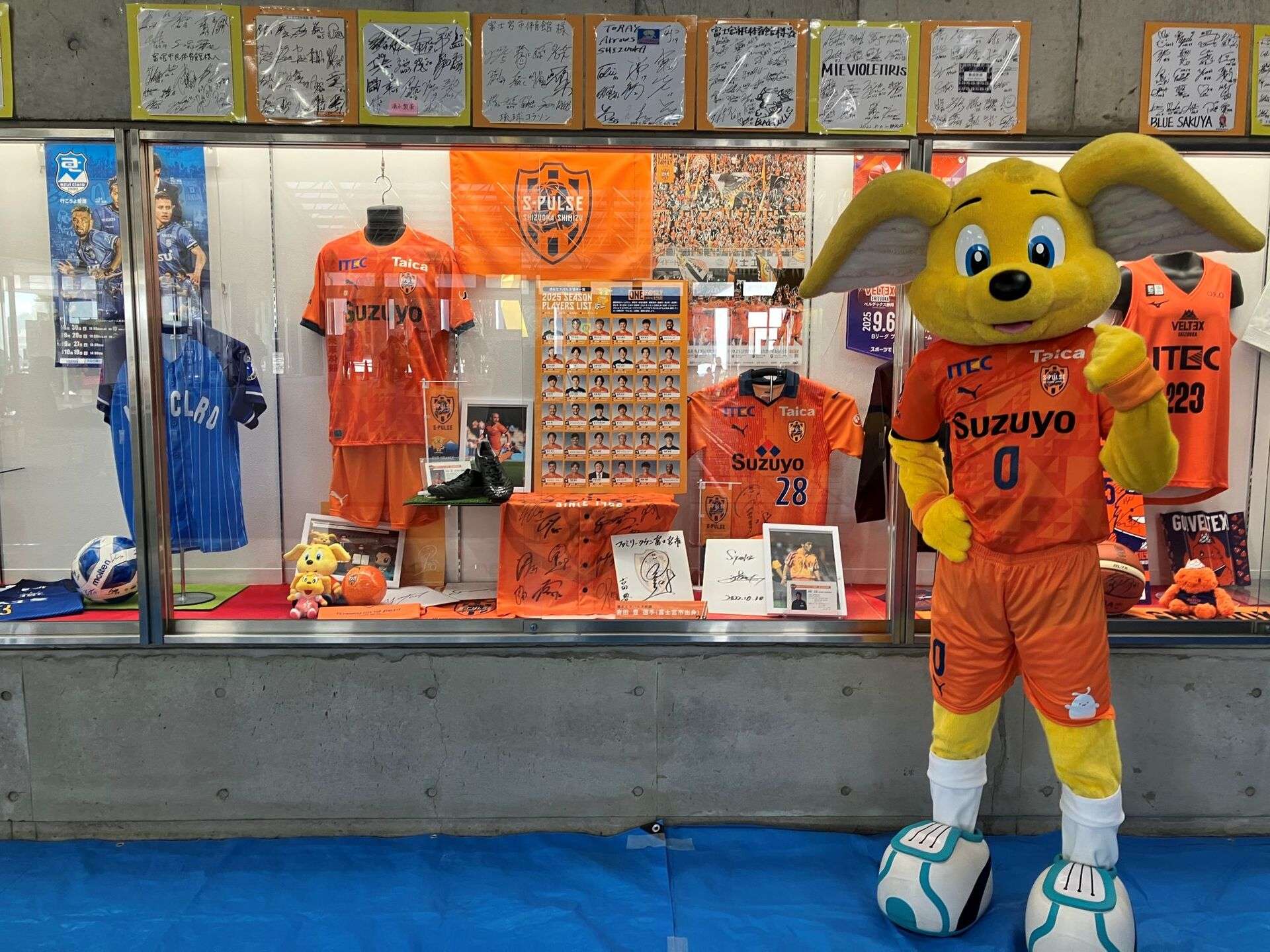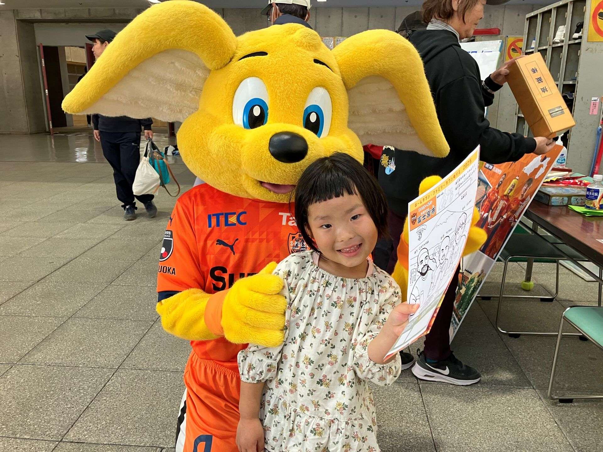 富士宮市民体育館には、富士宮市出身の吉田豊選手や澤登正朗ユース監督のサイン色紙などのエスパルスグッズも展示されています。「今、SDF富士のエスパルススクールで、すずコーチに教わってきました!」「サッカーがうまくなれるよう頑張ります!」といった子どもたちの声も聞けて、パルちゃんは参加者の皆さんと写真撮影をしたり、一緒にスポーツを体験したりして、ふれあいました。