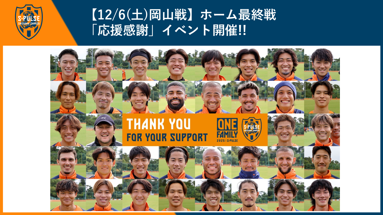 ”#エスパルスカメラ部” 高橋祐治選手と広報スタッフにより、選手たちの笑顔のアップ写真を撮り下ろし。2025シーズンの応援に感謝を込めた最高のスマイルを集めています!この写真をデザインし、国立競技場でのホームゲーム開催時に選手入場ホールに掲出したスペシャルビジュアルの新バージョンを準備中。「ONE FAMILY THANKSカード」にプリントして、ご来場の皆様にプレゼントします。