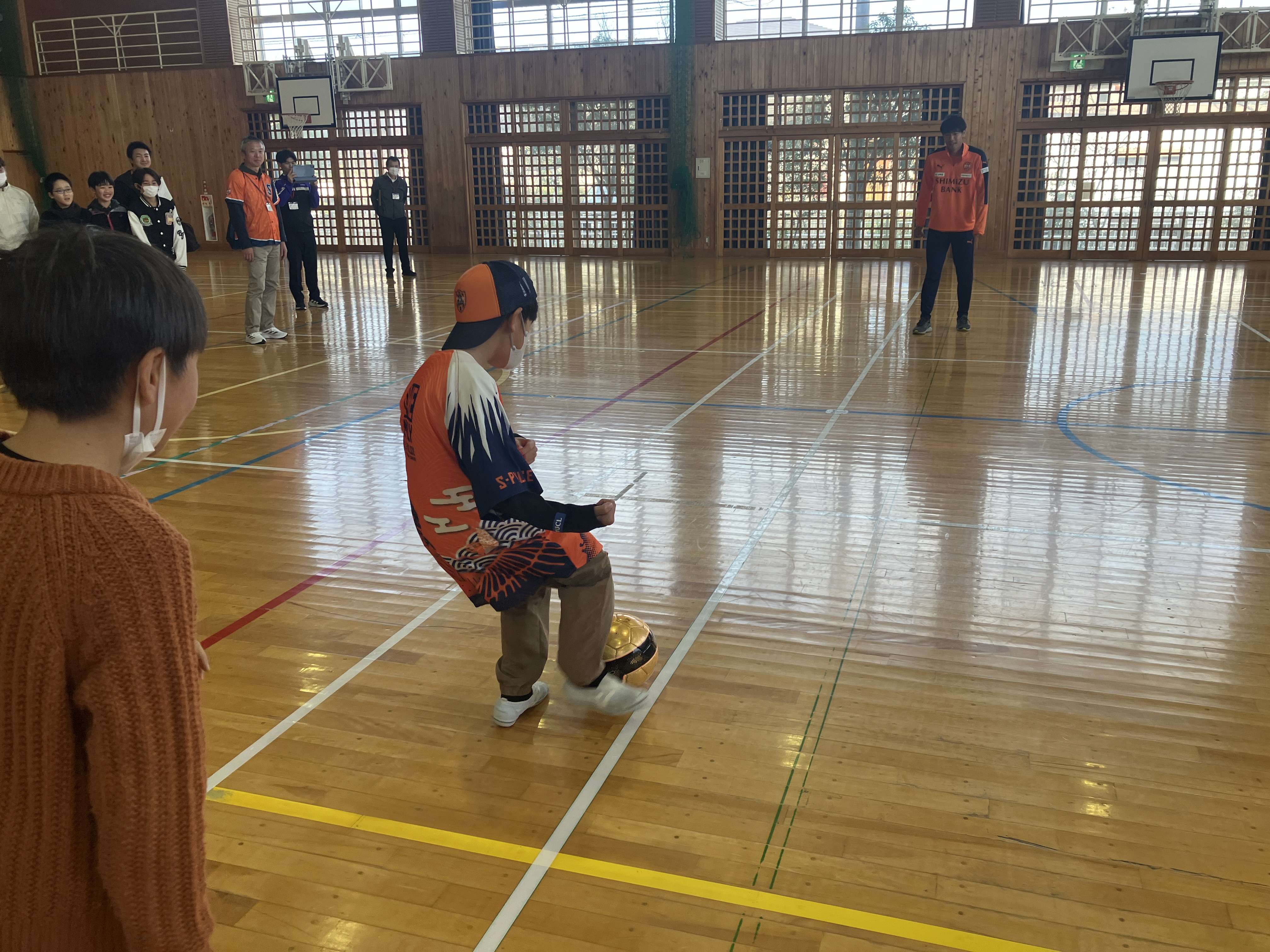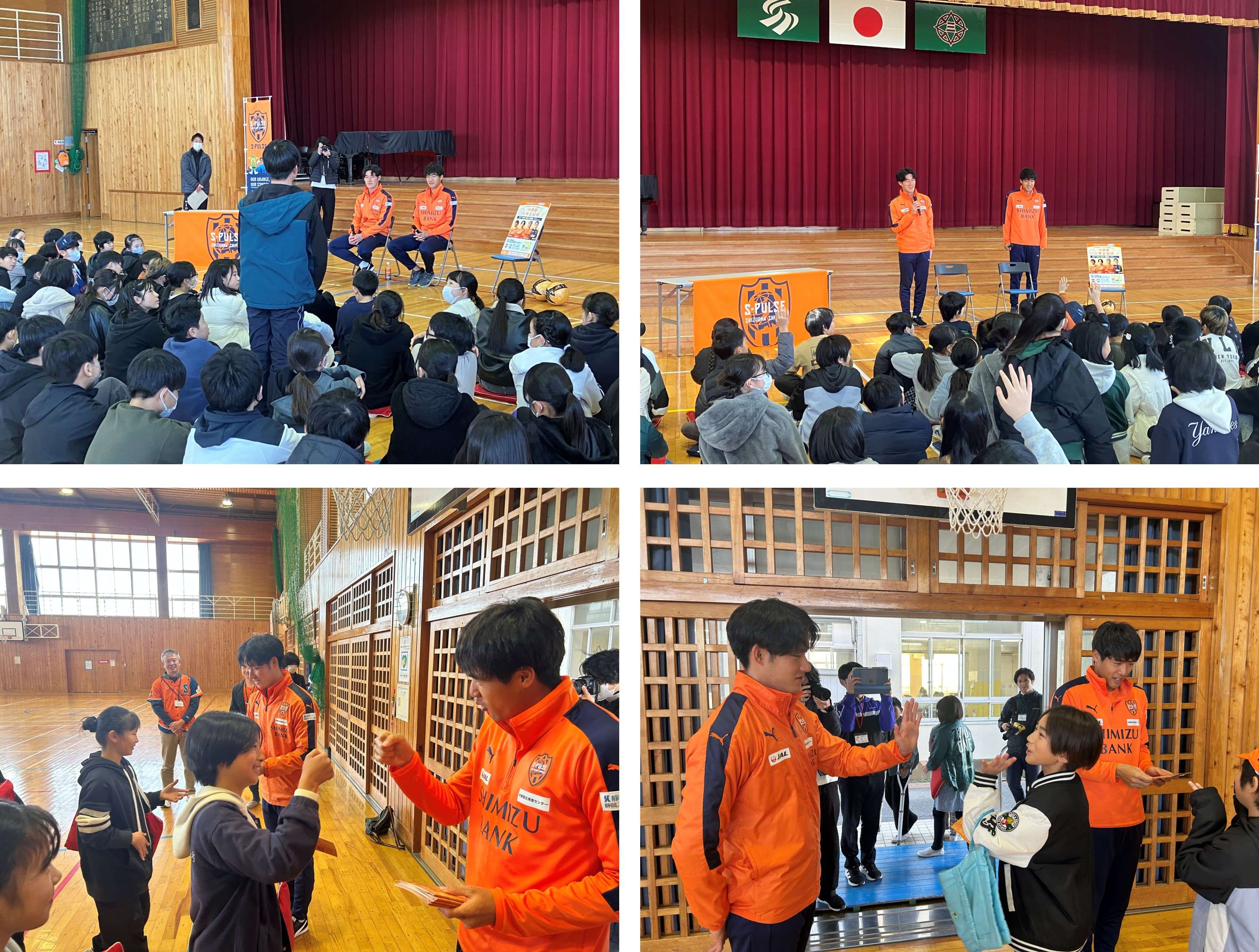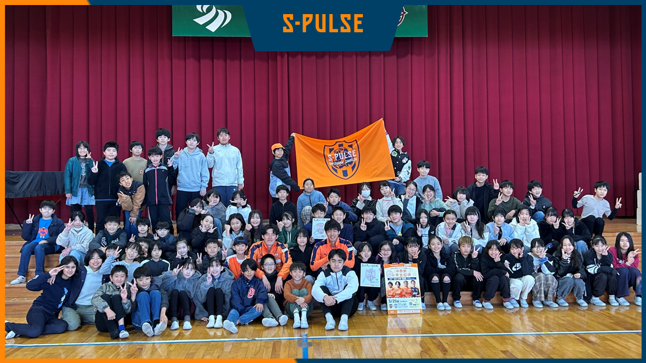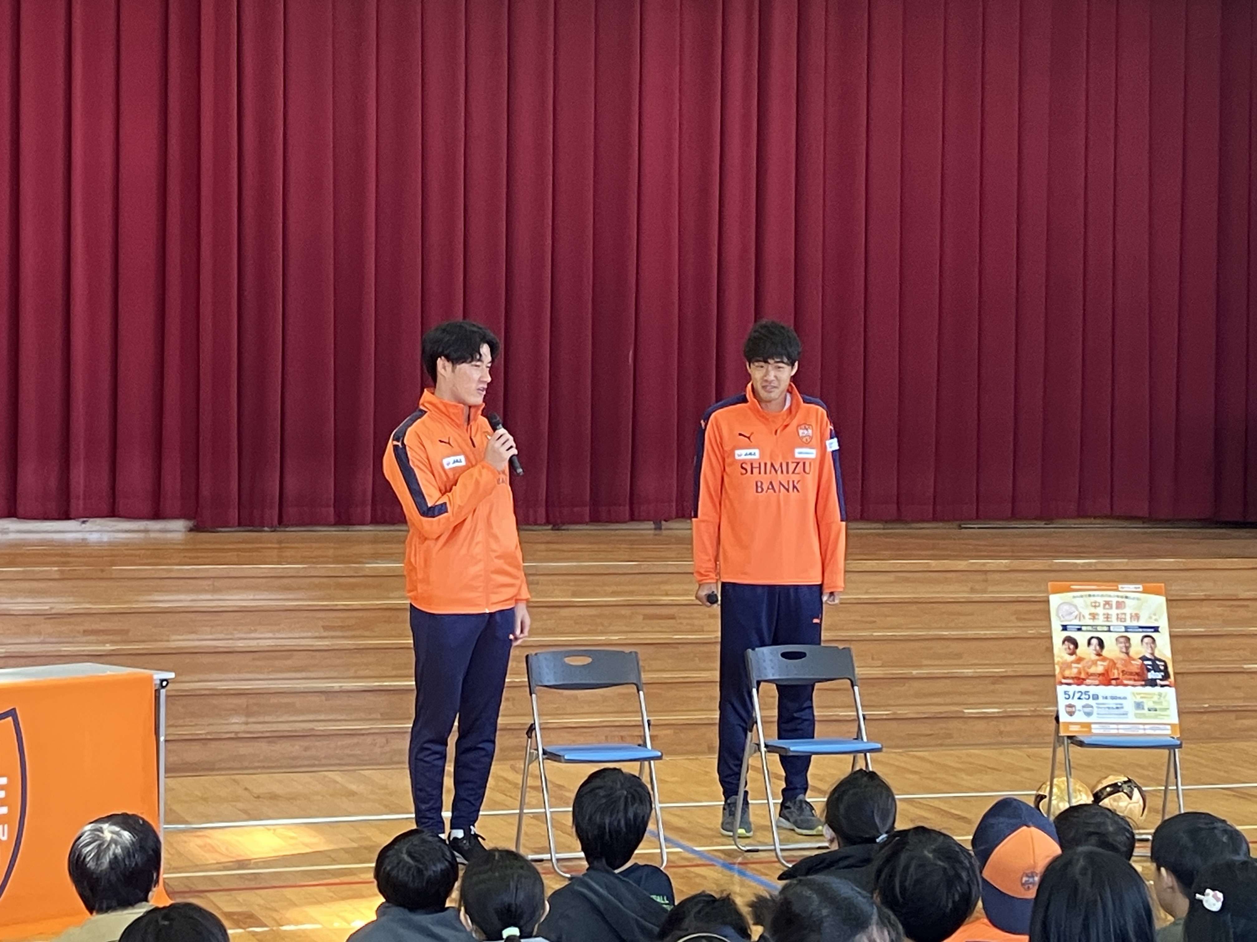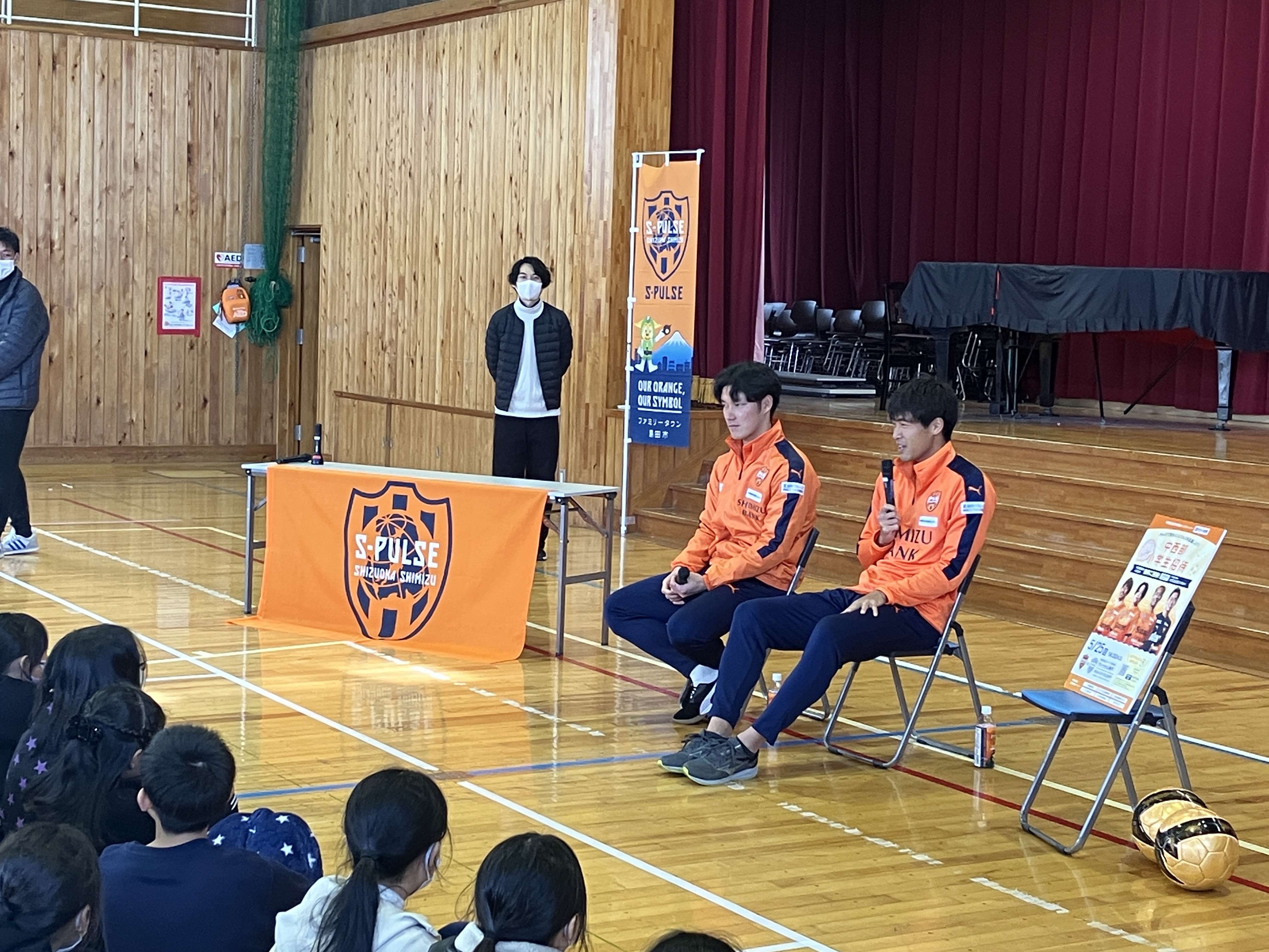 12月11日(木)、エスパルスが実施したホームゲーム招待企画『中西部小学生招待事業』(トップパートナー: サカイ産業株式会社)(パートナー:木内建設株式会社、せいうん法律事務所、有限会社総合保険タスカル、不二高圧株式会社、山内木材産業株式会社、株式会社ヤマシタ)の御礼企画として、猪越優惟選手と羽田健人選手がファミリータウン島田市の島田市立島田第三小学校(5,6年生80名)を訪れ、交流を深めました。