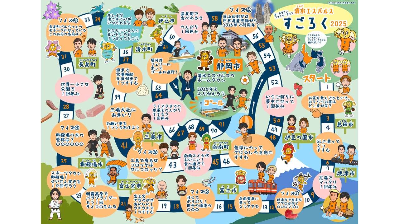 2025シーズン終了時に所属していた全選手・監督のイラストと共に、エスパルスのホームタウン・ファミリータウンを旅する気分ですごろくをお楽しみいただき、ご家族やご友人と2025シーズンを振り返っていただけたら嬉しく思います。
