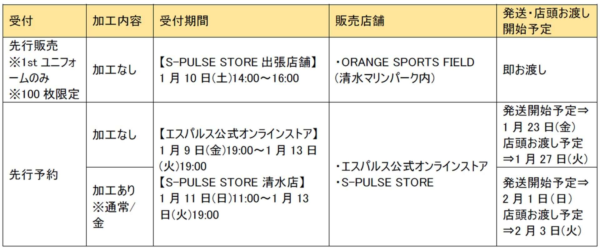 ・出張店舗でご購入いただいた加工なし1stユニフォームは、清水店にて1月10日(土)~1月13日(火)の期間、ネーム/背番号(通常・金文字)のお申し込みが可能です。