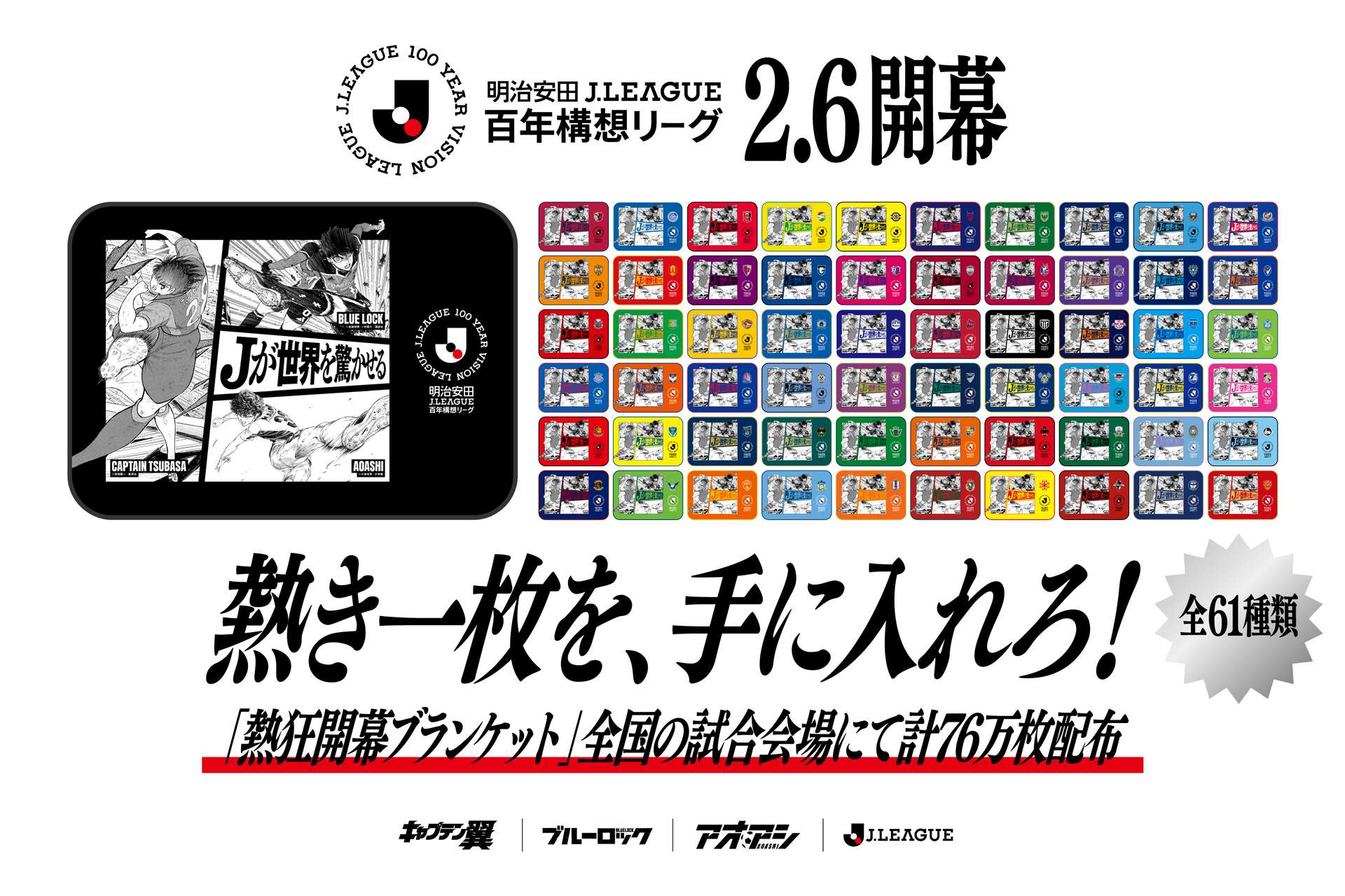 Jリーグでは、2026年2月6日(金)に開幕する明治安田Jリーグ百年構想リーグの開幕を記念し、2026年2月から3月にかけて行われる開幕期の対象試合において、クラブごとにデザインされた特製ブランケット(全61種)を合計76万枚、来場者の皆さまにプレゼントいたします。