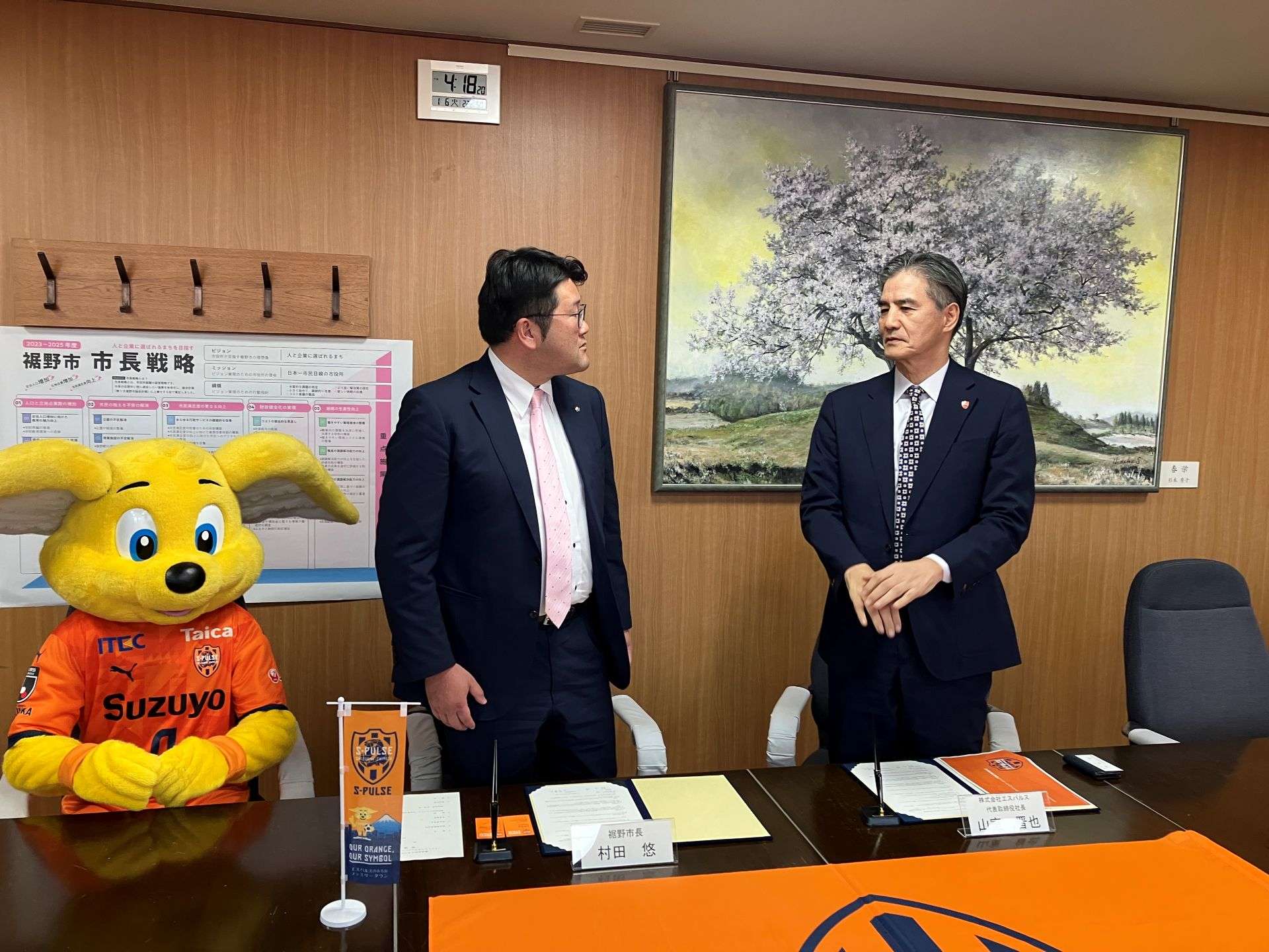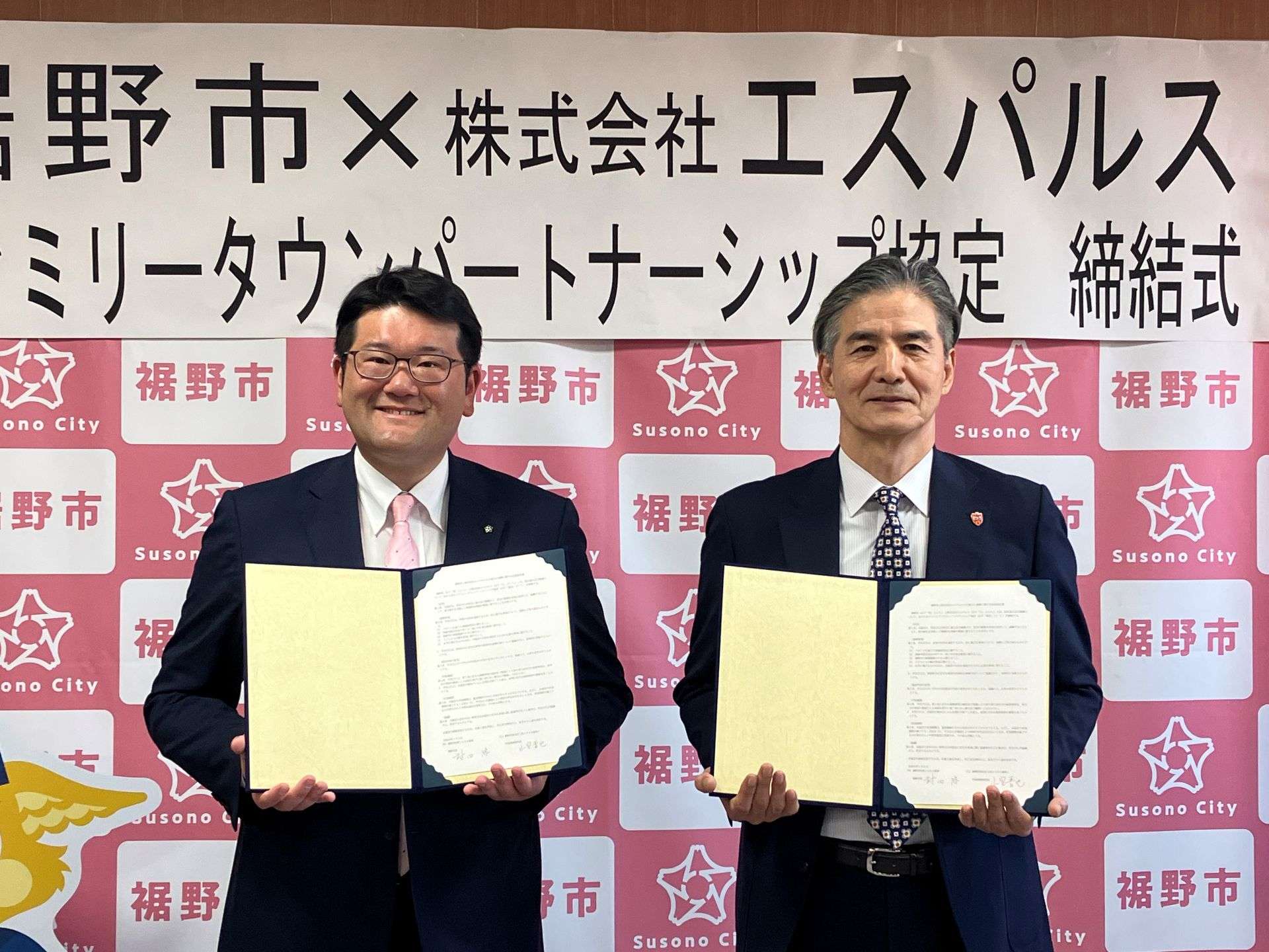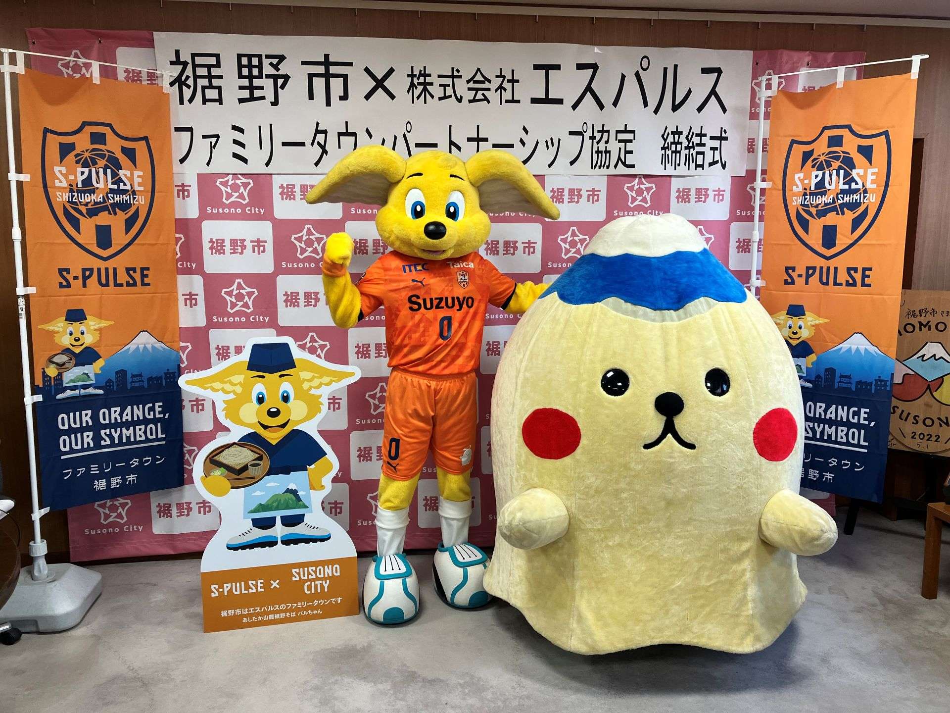 このたびは裾野市様とファミリータウンパートナーシップ協定を締結させていただくこととなりまして、誠にありがとうございます。この協定を通じて裾野市の皆様にスポーツを通じた地域活性化や持続可能な社会づくりなど、様々な課題に対して一緒に取り組んでいけたら幸いです。現在ジュニアユース三島には4名の裾野市在住の選手が在籍しております。いずれエスパルスのトップチームの主力として、裾野市を代表するJリーガーとして活躍してくれることを願っております。また、今回の協定締結に際し、「あしたか山麓裾野そば」をモチーフにしたパルちゃんも制作いたしました。新たにイラストを制作したパルちゃんと共に、裾野市のシティプロモーションに協力させていただけたらと思います。今後ともどうぞよろしくお願いいたします。