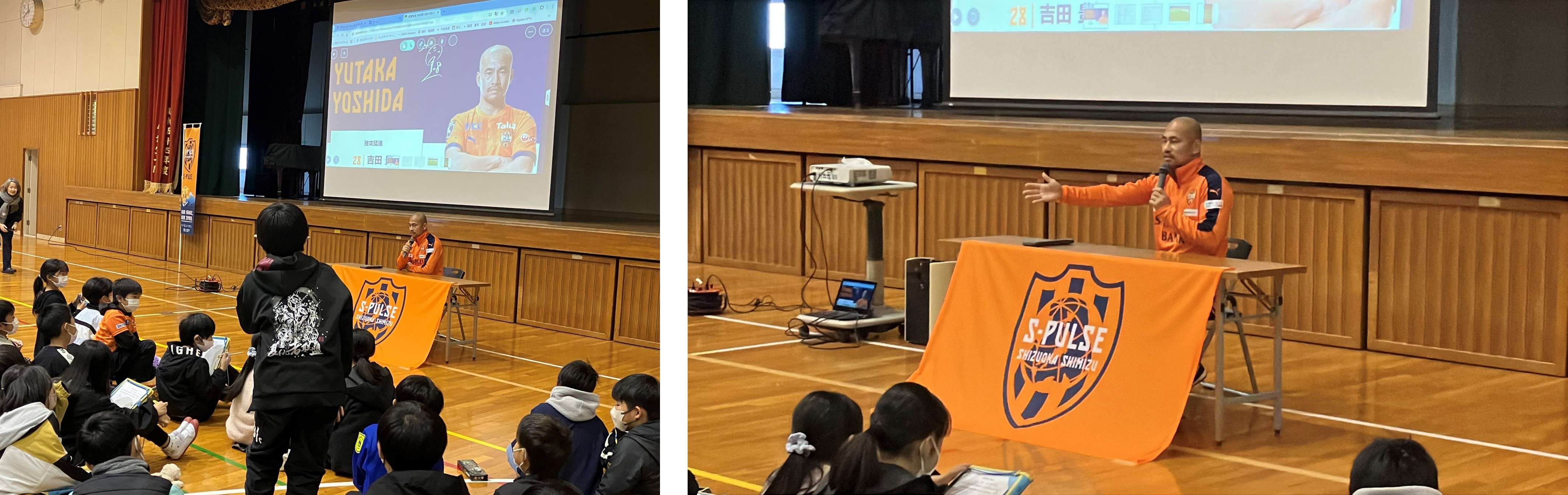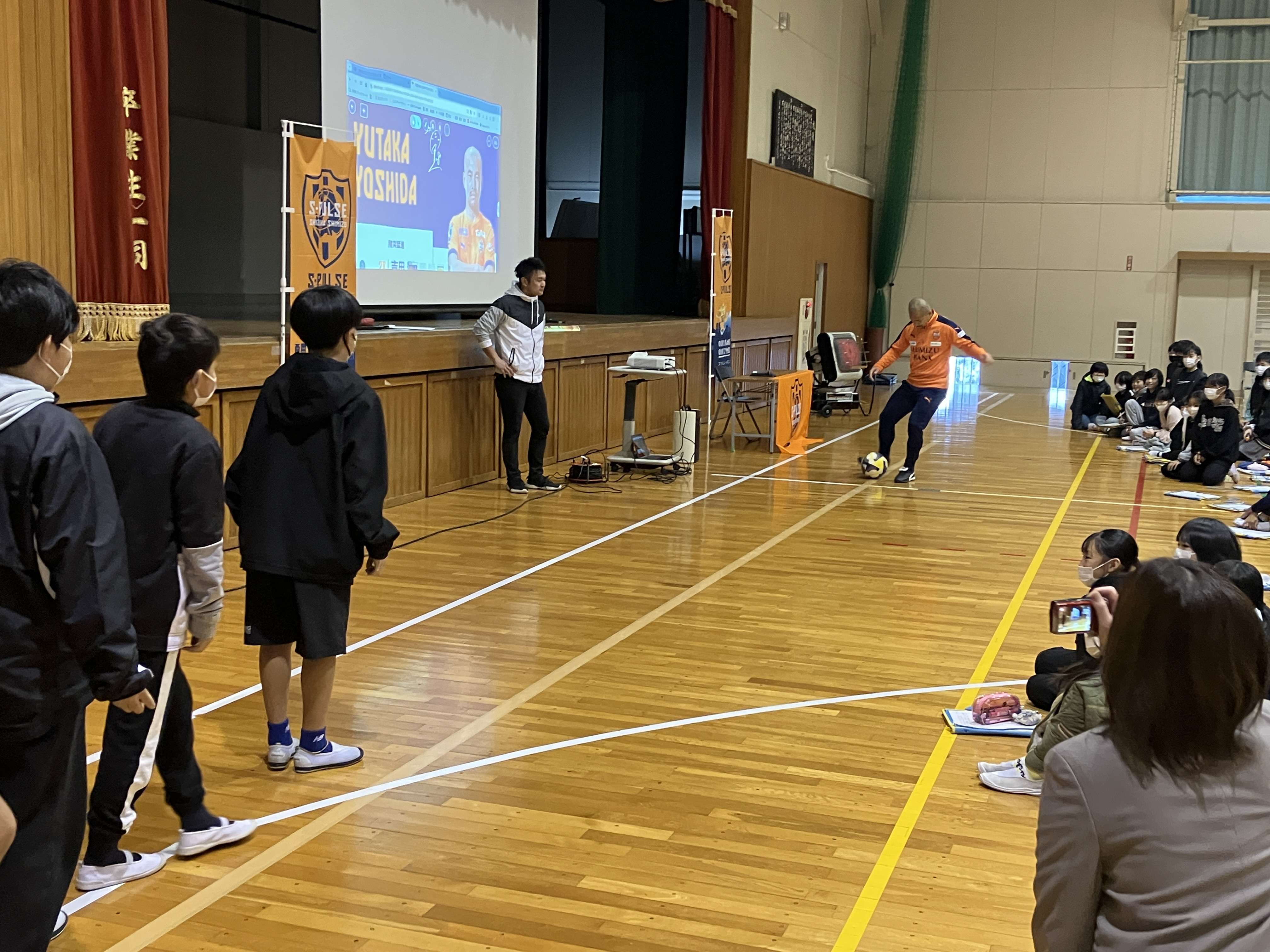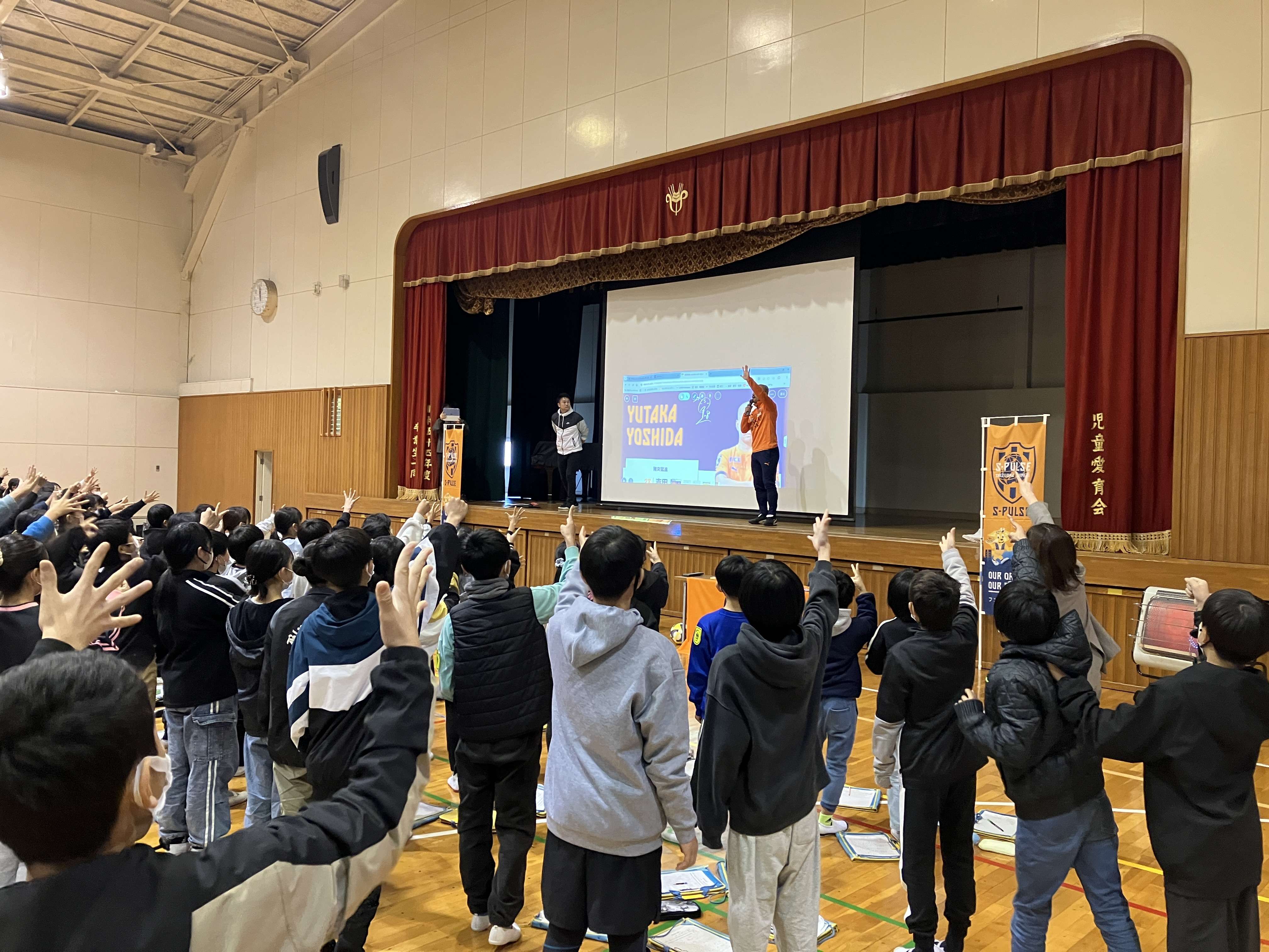 エスパルスの選手入場曲「雷神」の音楽が鳴り響く中、吉田選手が体育館に登場すると、多くの児童が心待ちにしていた様子で拍手で出迎えてくれました。