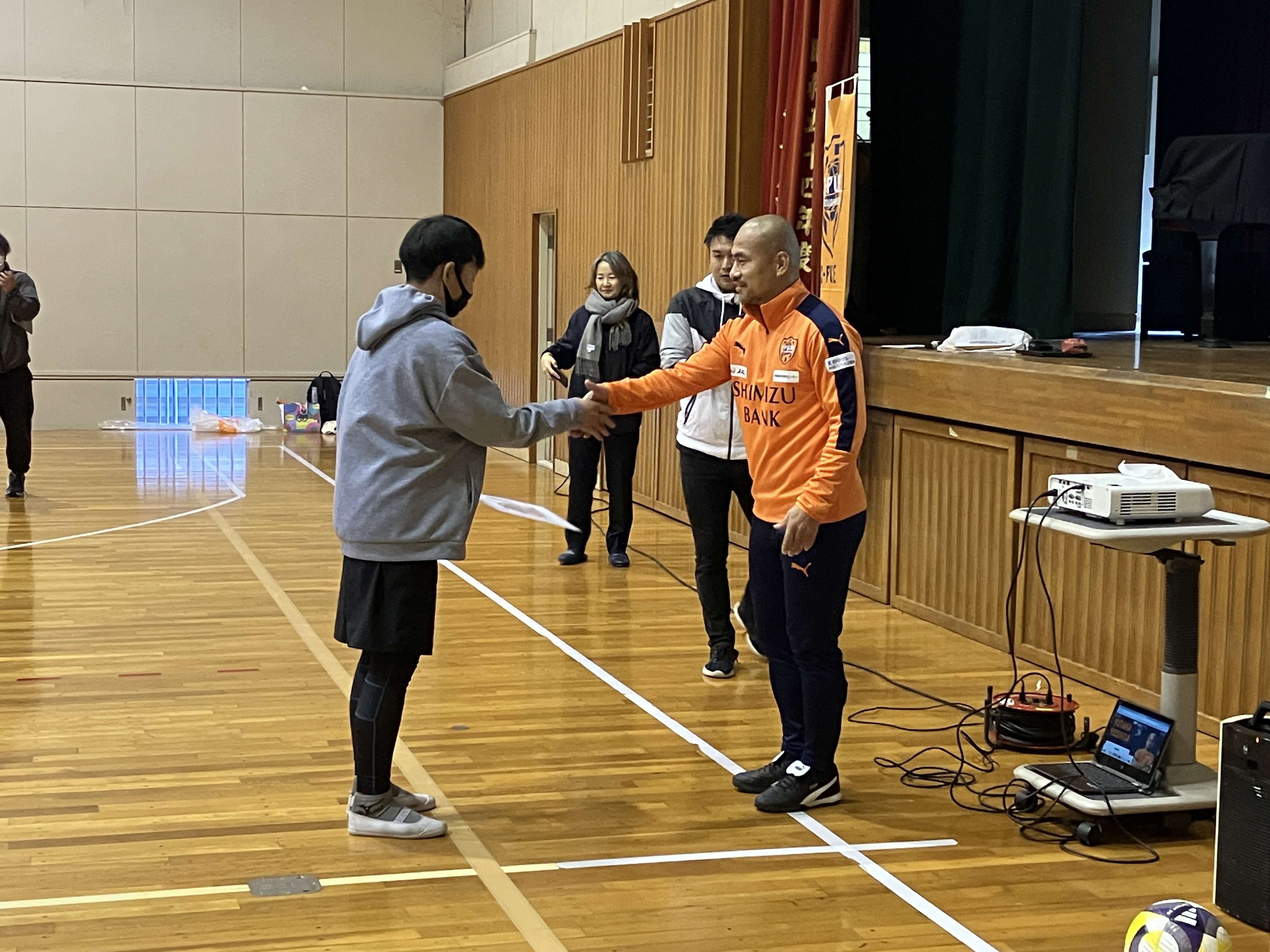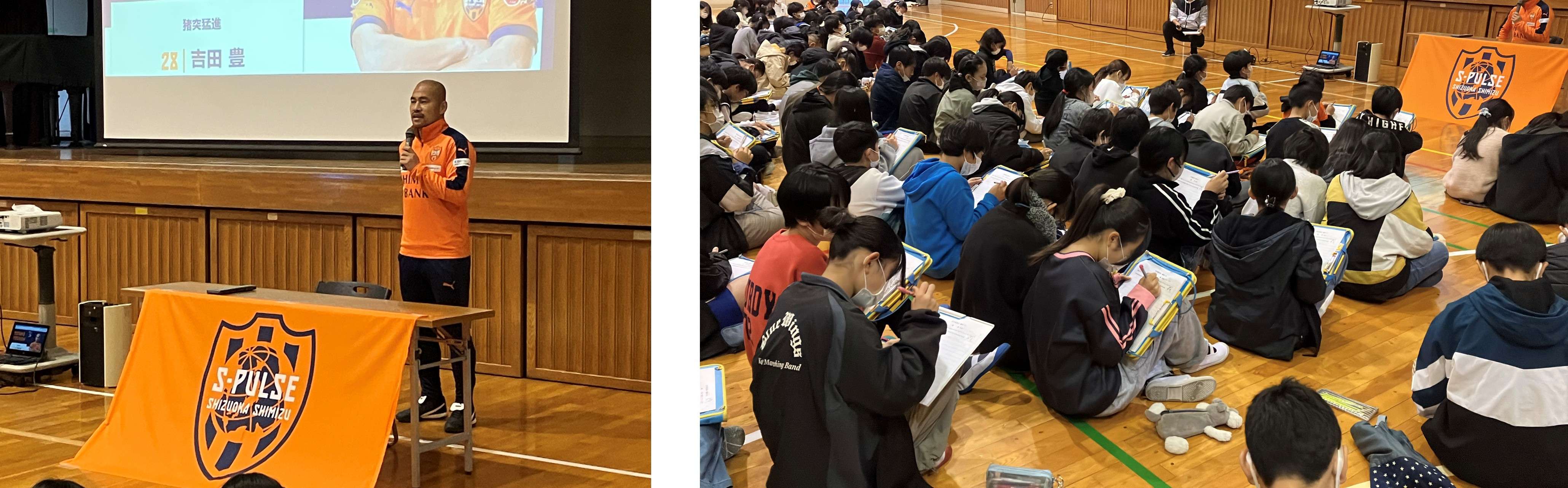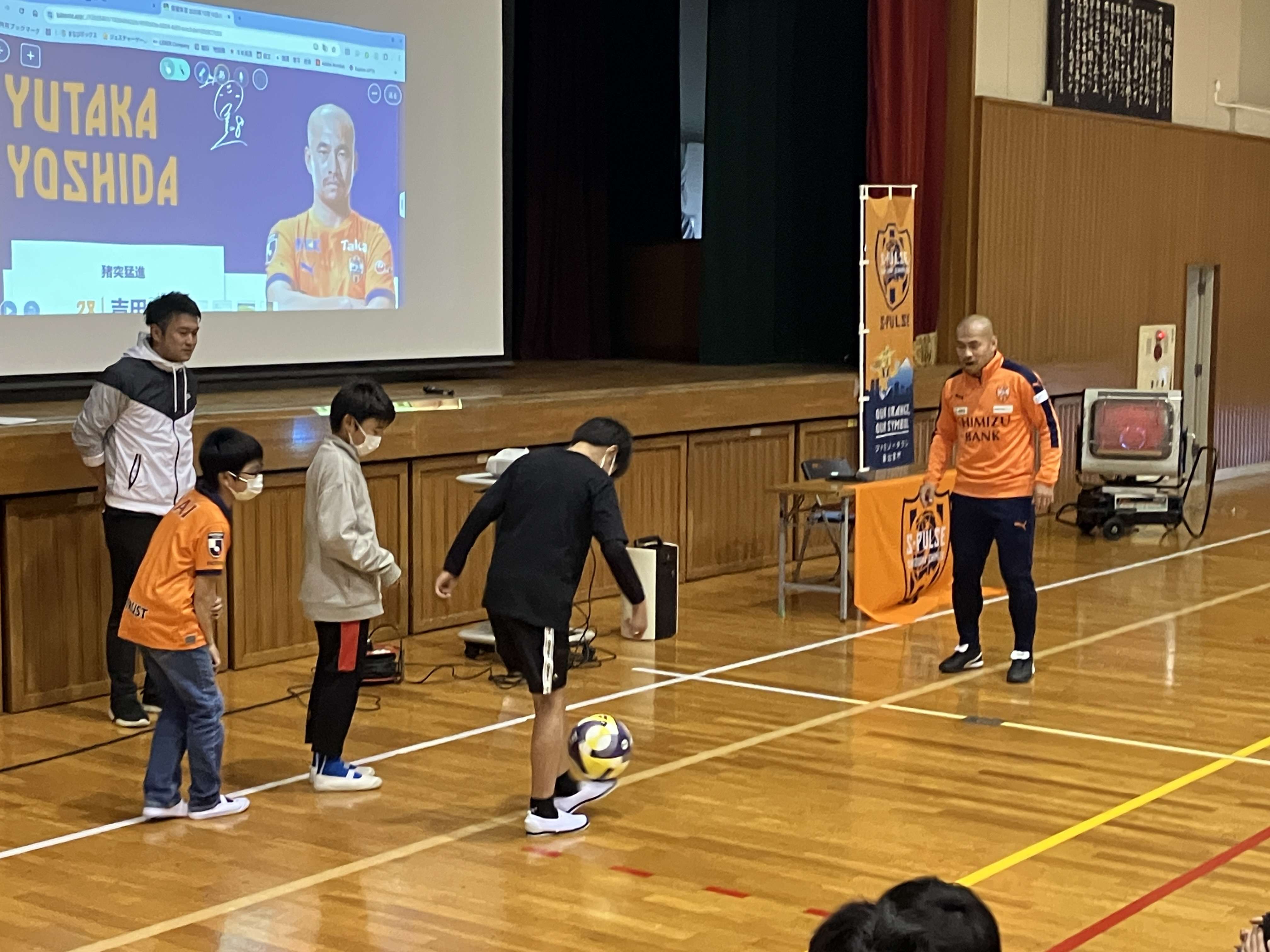 エスパルスの選手入場曲「雷神」の音楽が鳴り響く中、吉田選手が体育館に登場すると、多くの児童が心待ちにしていた様子で拍手で出迎えてくれました。