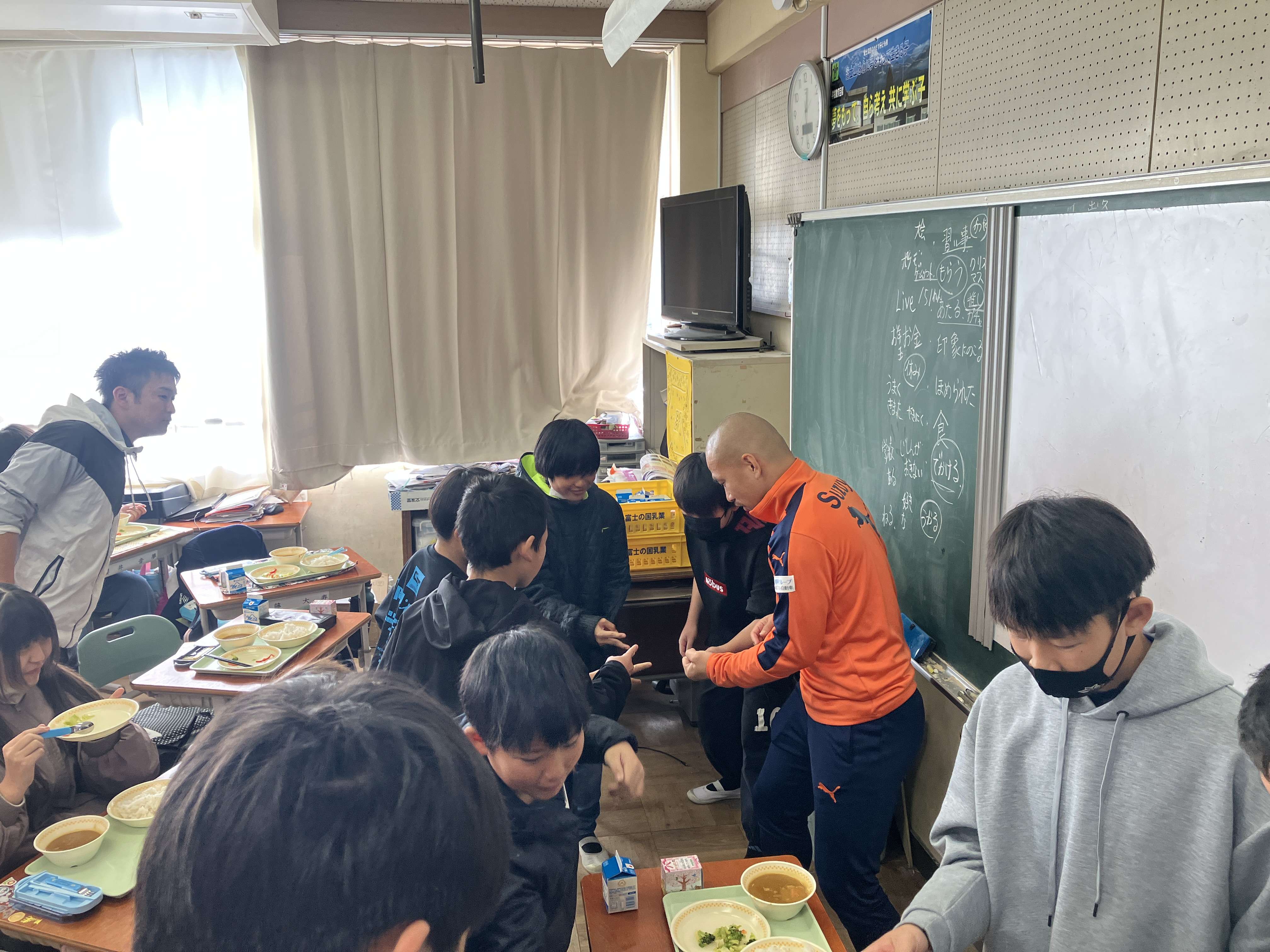 体育館での交流を終えた後、教室にお邪魔して一緒に給食をいただきました。この日のメニューはカレー、サラダ、クリスマスデザートでした。給食でのメインイベントといえば「おかわりじゃんけん」ということで、吉田選手もデザート争奪戦に参戦しました。結果は見事勝利!デザートを一つ追加でGETしました。児童の皆さんとの会話を楽しみつつ、すべて美味しくいただきました。