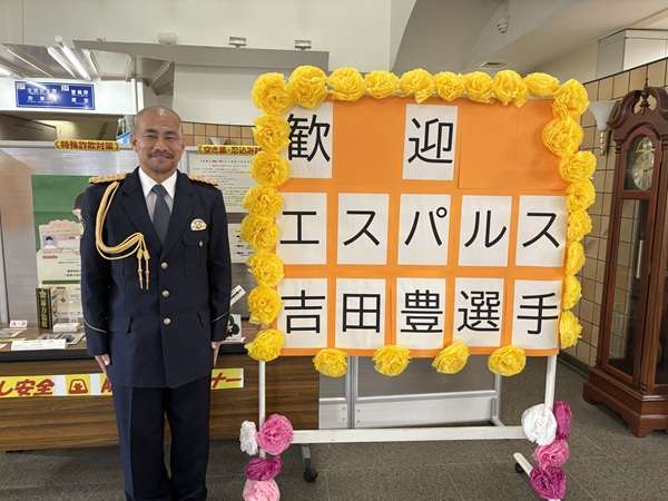 1月7日(水)、清水エスパルスの吉田豊選手が、地元富士宮市の富士宮警察署で一日署長として、1月10日の「110番の日」広報活動に参加しました。
