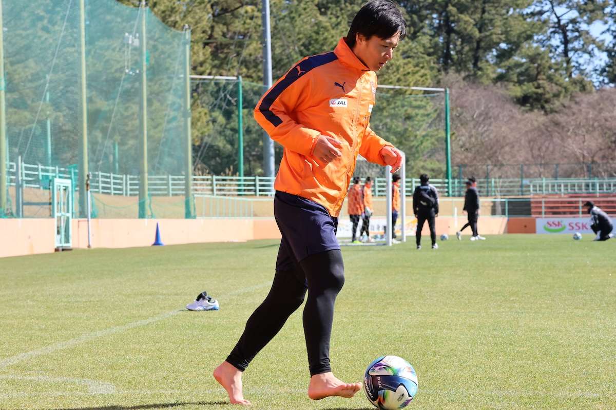 オフ明けの2月2日、アクティブレストが中心だった全体トレーニング後、松崎快は裸足でボールを蹴りながら、何周も三保グラウンドのピッチを走り続けた。嶋将平コーチに寄り添ってもらいながら、フィールドプレーヤーの中で誰よりも遅くまでグラウンドを走る姿は、鹿児島キャンプ中も、三保に戻ってからも変わらない光景だ。