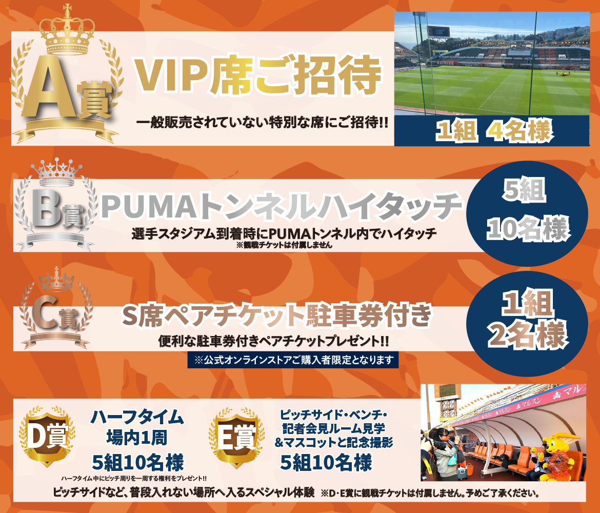 ・B賞、D賞、E賞には当日の試合観戦チケットは付属いたしません。観戦チケットは別途ご用意ください。