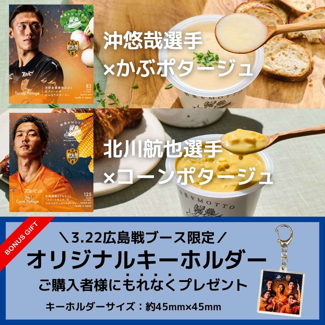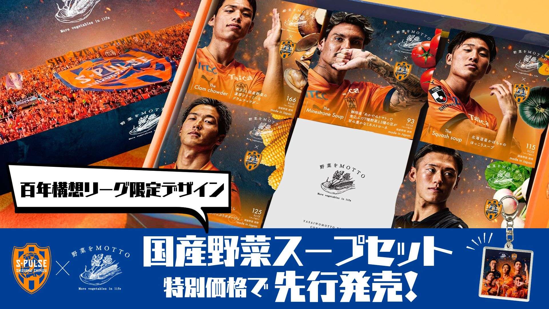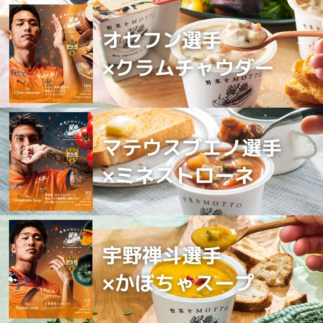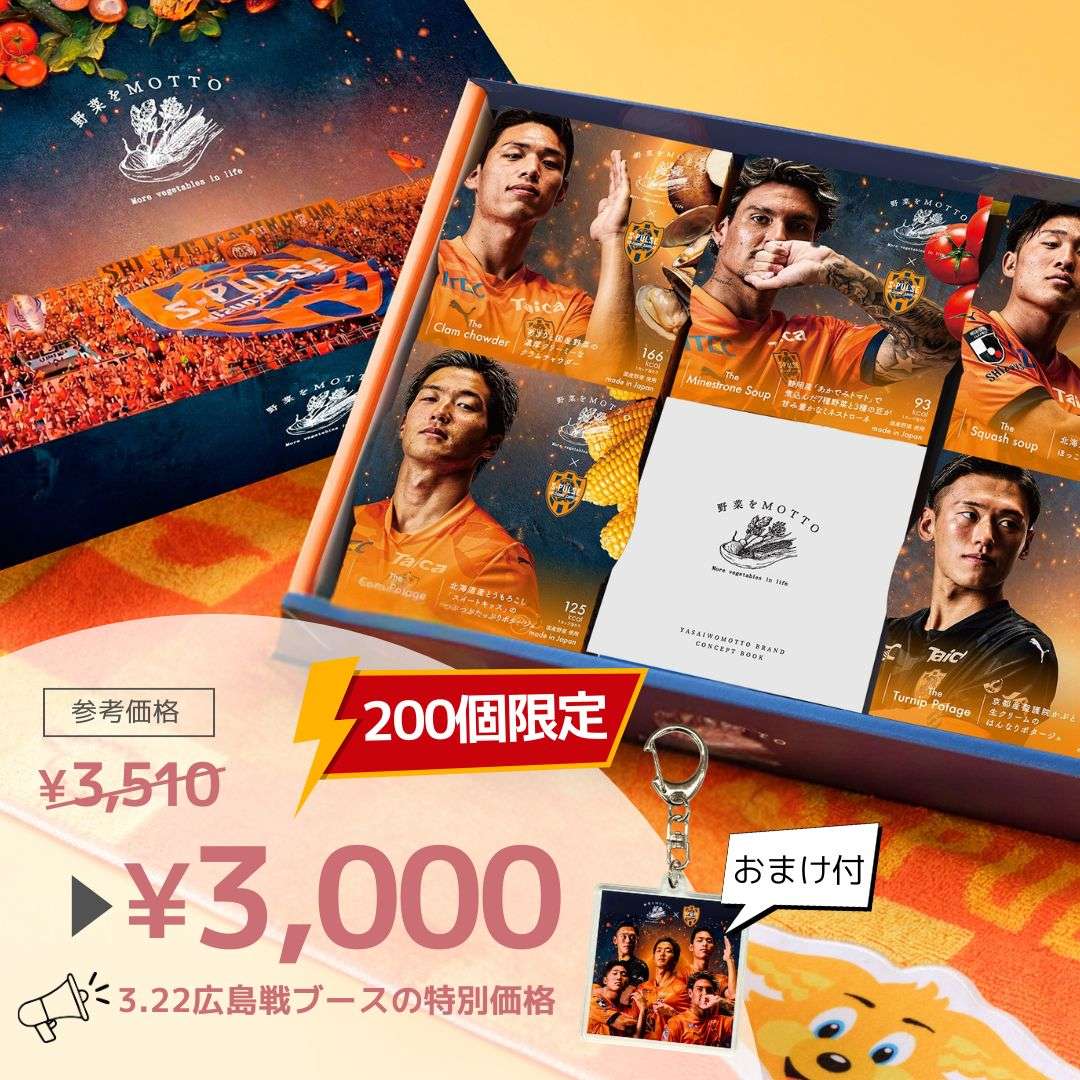 3/22広島戦にて、野菜をMOTTOのエスパルスコラボ国産野菜スープセット【百年構想リーグ限定デザイン】を特別価格で先行販売決定いたしました!!!!